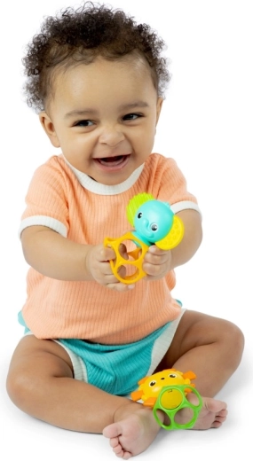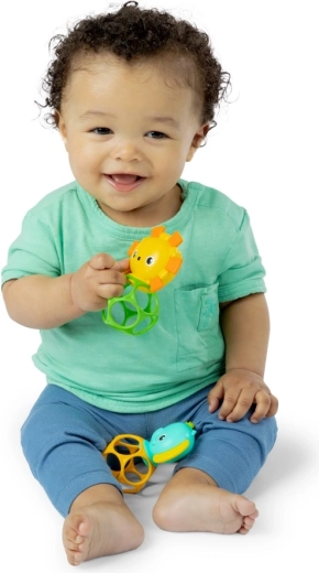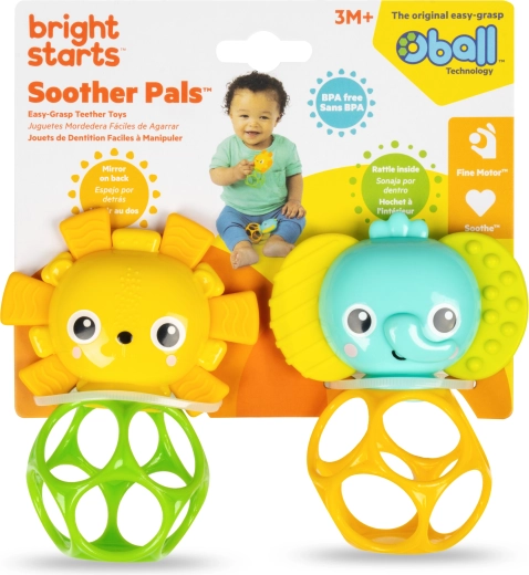 Objevte uklidňující zábavu s kousátky OBALL Soother Pals. Dvě roztomilé postavičky – lev a slon – kombinují více textur pro žvýkání, chrastění a zkoumání. Otevřená mřížková struktura OBALL Bright Starts podporuje správný úchop a koordinaci ruka-oko, zatímco lehká konstrukce je ideální pro první pokusy o držení a třesení.