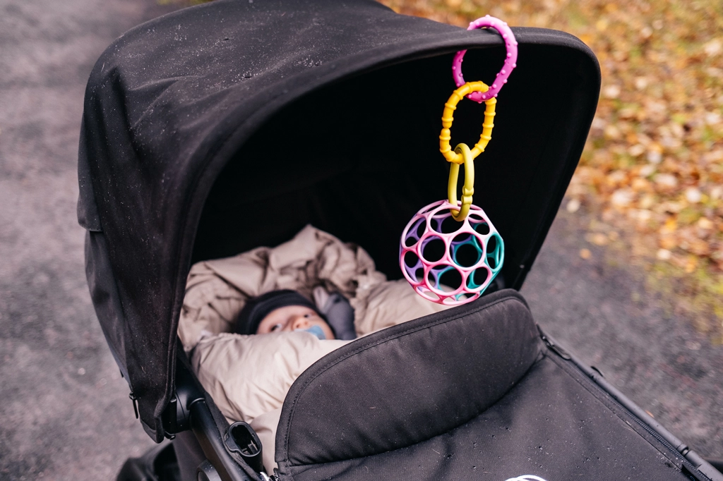 Díky odolnému provedení a snadnému uchycení k pojistným kroužkům je míček perfektní do kočárku nebo autosedačky.
