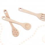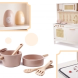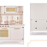 Tato dřevěná kuchyňka inspirovaná retro a boho stylem zaujme elegantní kombinací bílé, krémové a zlatých detailů. Většina prvků je ze dřeva/MDF, povrch je hladce zabroušený a natřený netoxickými barvami pro bezpečnou hru. Otočné knoflíky, otevírací dvířka a háčky na náčiní lákají k objevování a učí děti pořádku i organizaci.