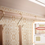• Realistické detaily: kovově zlatý kohoutek, závěsná lišta s háčky, ratanový efekt na dvířkách trouby.