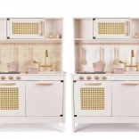 Stylová dětská kuchyňka v retro BOHO designu přináší hodiny kreativní hry. Má hluboký dřez se zlatým kohoutkem, ovládací knoflíky, troubu s ratanovým panelem, praktické police a skříňky a bohaté dřevěné příslušenství. Díky světelným a zvukovým efektům varných plotýnek působí hra realisticky a rozvíjí fantazii i jemnou motoriku.