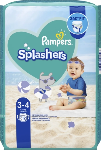 Jednorázové plenkové kalhotky do vody Pampers Splashers ve velikosti 3 jsou ideální do bazénu, na pláž i do akvaparku. Na rozdíl od běžných plenek nenasáknou vodou, takže drží tvar a pohodlně padnou i za mokra. Mají po celém obvodu pružný pas, dvojité lemy proti protečení a postranní švy, které lze snadno roztrhnout pro rychlé a čisté svlékání.