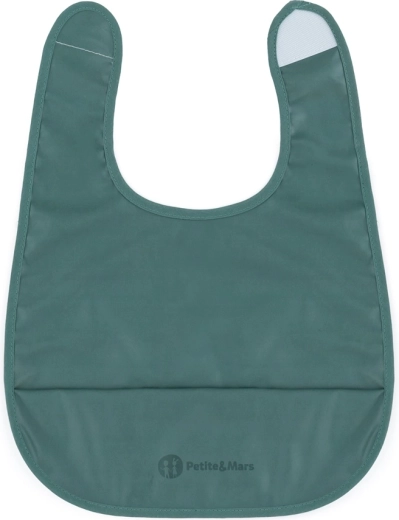 Stylový a praktický bryndák PETITE&MARS Nate v odstínu Misty Green udrží vaše miminko při jídle v čistotě a pohodlí. Je vyroben z odolného, voděodolného PU materiálu bez PVC a ftalátů, má kapsu na drobky, jemné nastavitelné zapínání na suchý zip a snadno se čistí pouhým otřením.