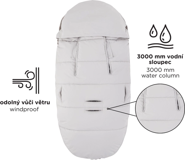 Speciální ekologická impregnace bez škodlivých fluorokarbonů zajišťuje vysokou odolnost vůči vodě (3000 mm) i větru, aby dítě zůstalo v teple a suchu.
