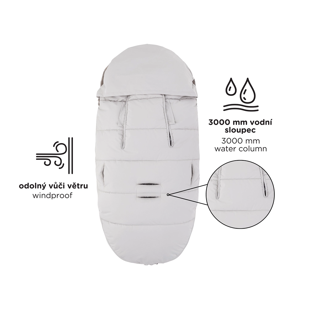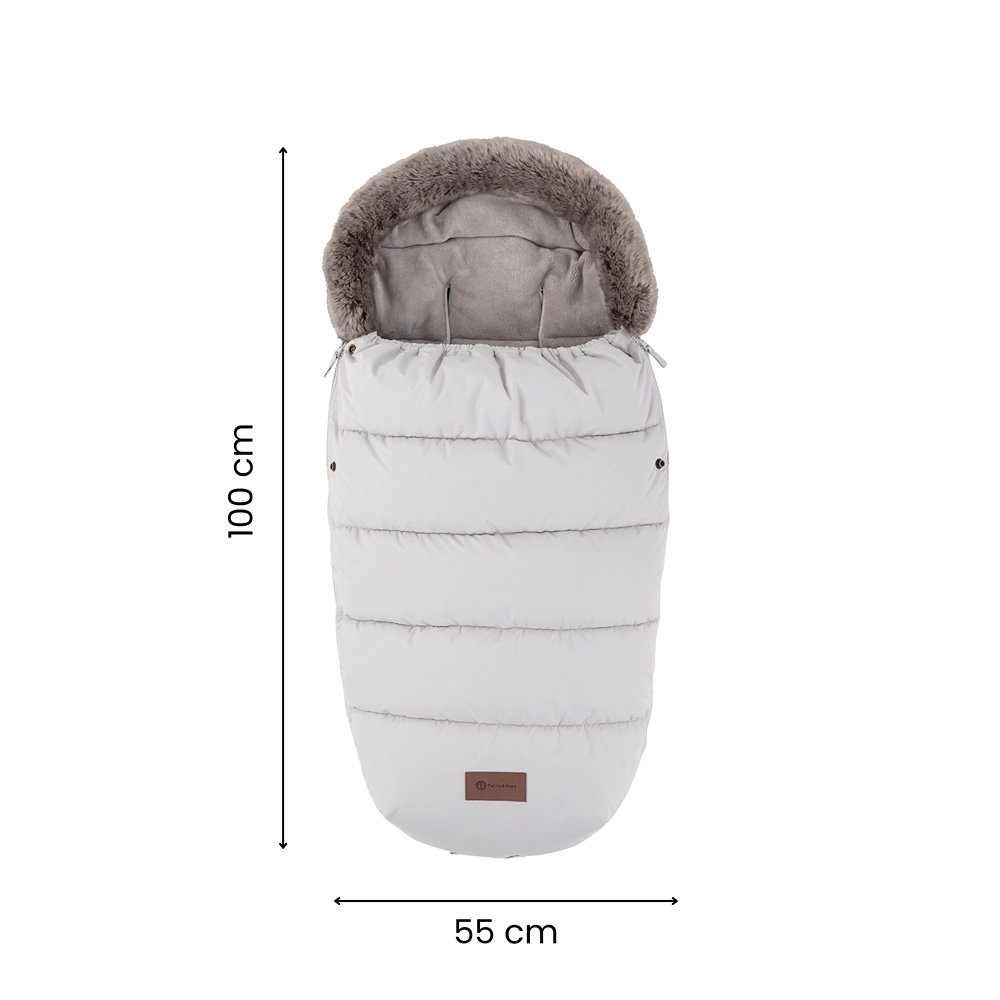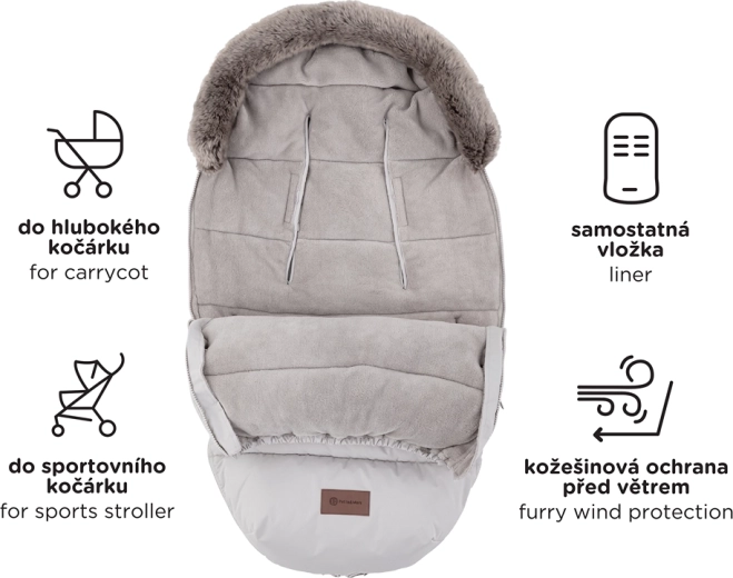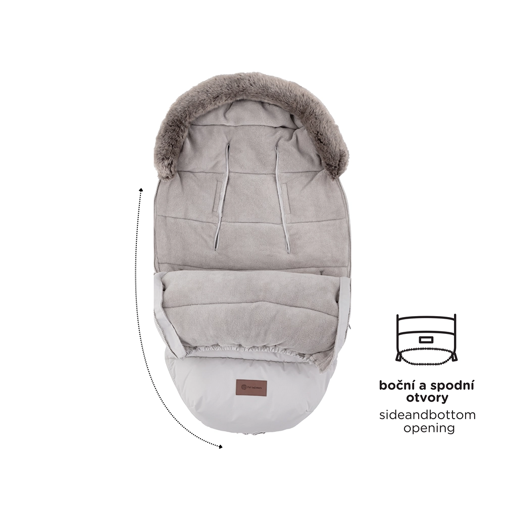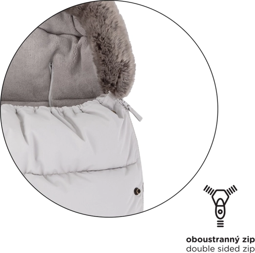 Promyšlené celopostranní zipy umožňují plné odepnutí horní části, větrání a vytvoření samostatné vložené podložky ze spodního dílu. Ve spodní části zipy vytvářejí praktický otvor na nožičky. Inteligentní prohnutá protiskluzová kapsa na zadní straně pomáhá držet fusak pevně na místě a odnímatelná kožešinka usnadňuje údržbu.