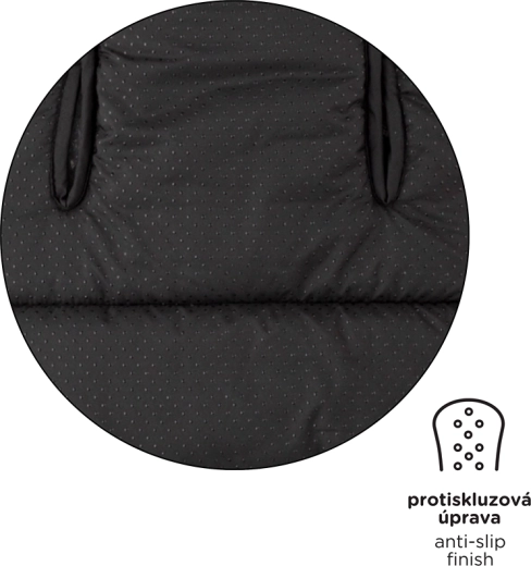 Vertikální otvory pro pásy a protiskluzová zadní strana (ABS) zajišťují bezpečné a stabilní uchycení ve většině kočárků i autosedaček.