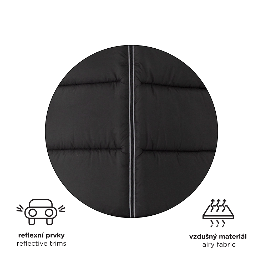 Promyšlené vertikální otvory pro bezpečnostní pásy zajišťují širokou kompatibilitu s většinou značek kočárků. Protiskluzová zadní strana (ABS) brání pohybu fusaku v sedačce a reflexní prvky zvyšují bezpečnost při zhoršené viditelnosti. Středový zip usnadní rychlý přístup k dítěti a spodní, snadno omyvatelná část je praktická i pro obuté nožičky.
