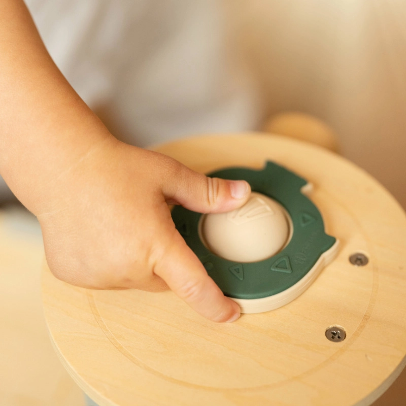 Elastické tlačítko lze mačkat a posouvat z obou stran, což podporuje trénink úchopu, koordinaci a soustředění formou hry.