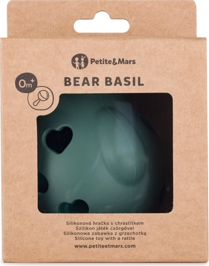 Roztomilý medvídek Bear Basil spojuje chrastítko a kousátko v jednom. Vyroben z 100% potravinářského silikonu bez BPA, je měkký, lehký a bezpečný pro miminka už od narození. Ergonomický tvar s otvory se snadno drží i v malých ručkách, jemné chrastění stimuluje sluch a různorodé textury podporují smyslový vývoj.