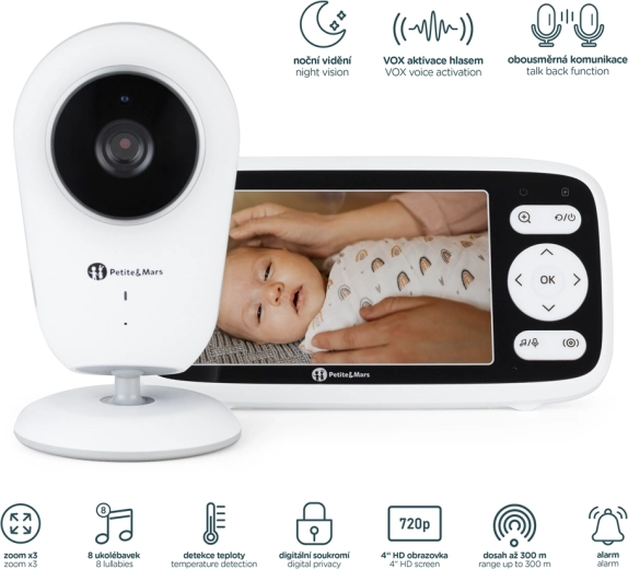 VOX aktivace šetří baterii, obousměrné audio utiší miminko vaším hlasem, měření teploty pohlídá komfort a 8 ukolébavek s alarmem pomůže s režimem.