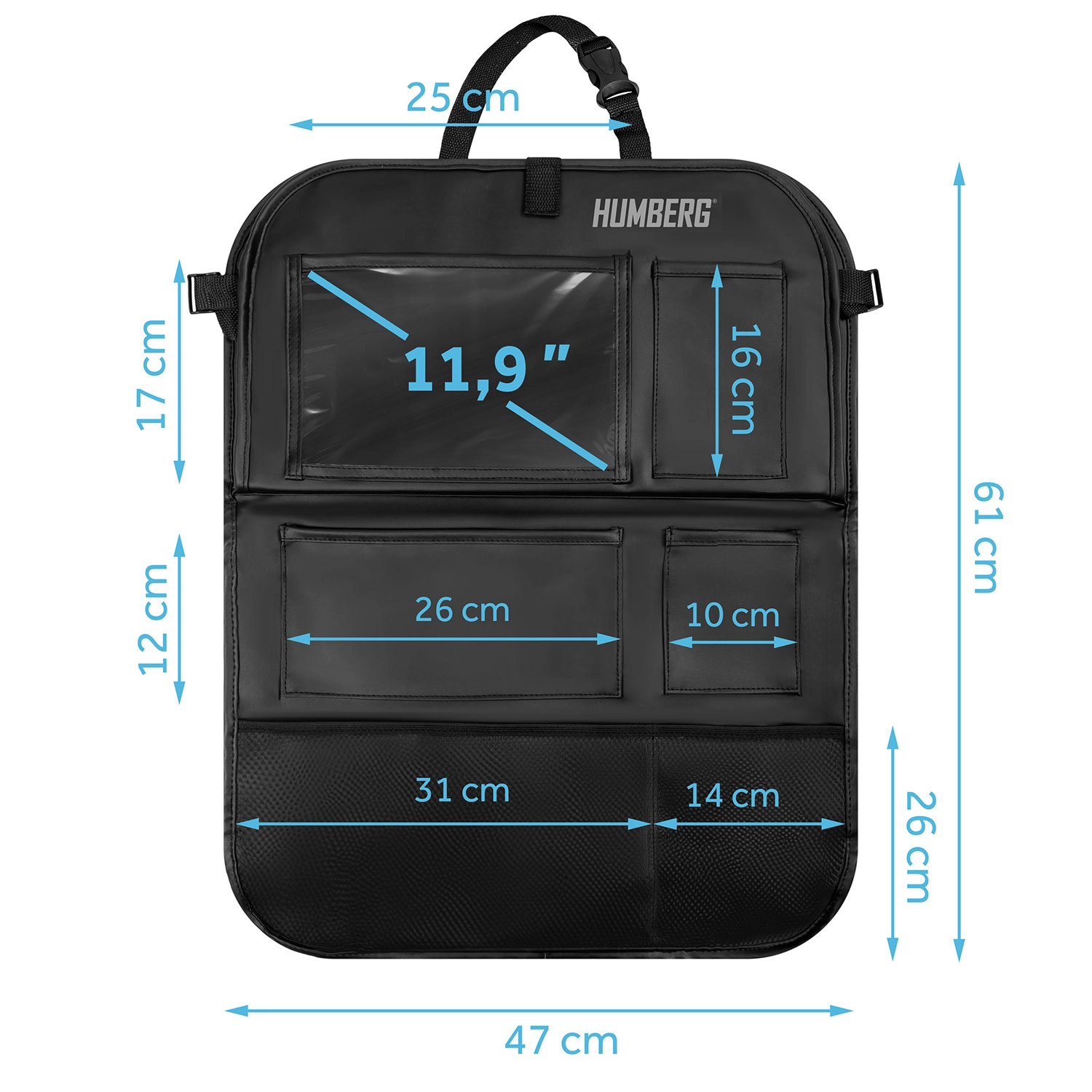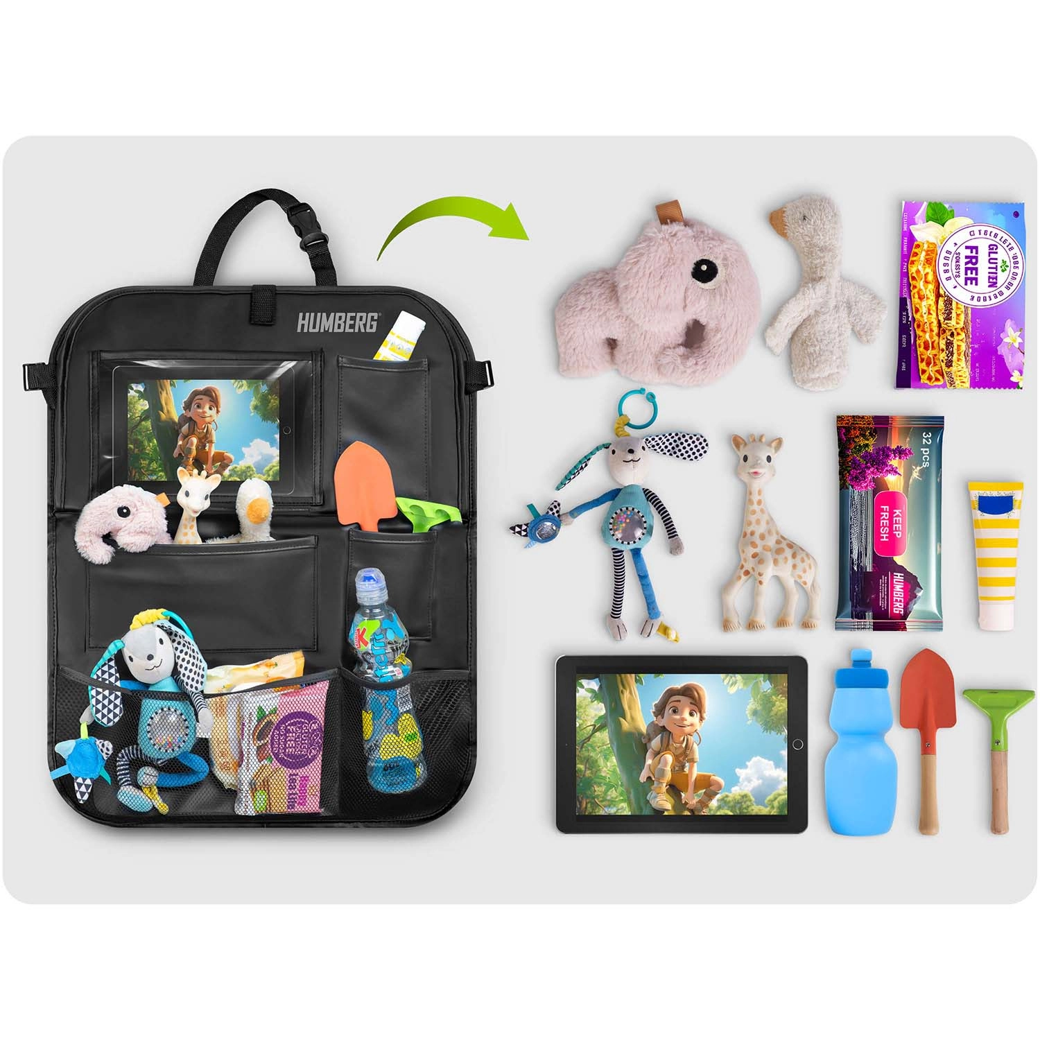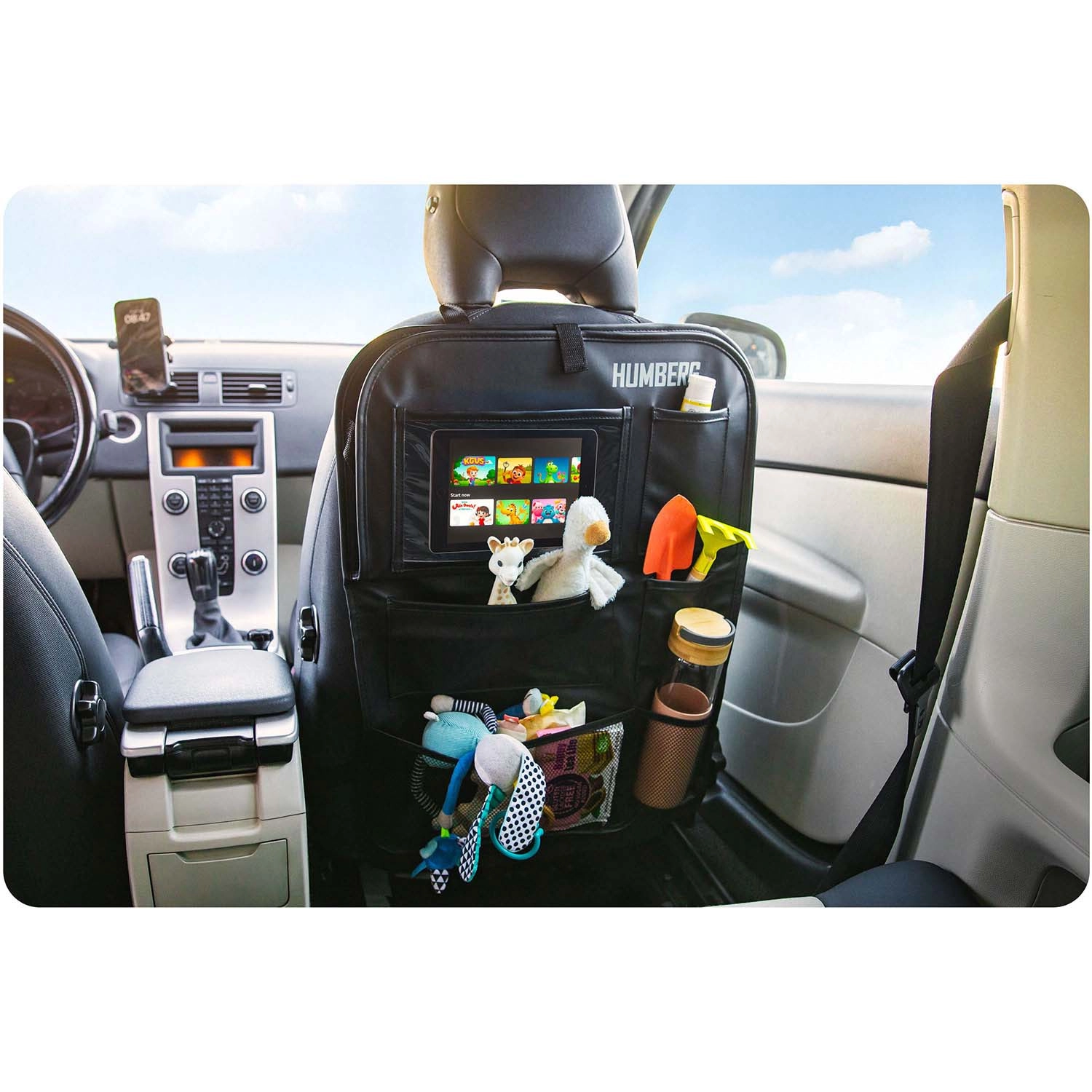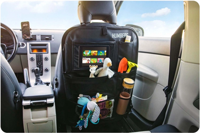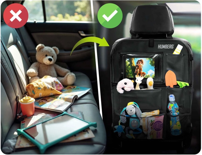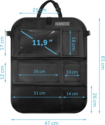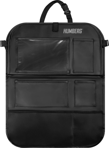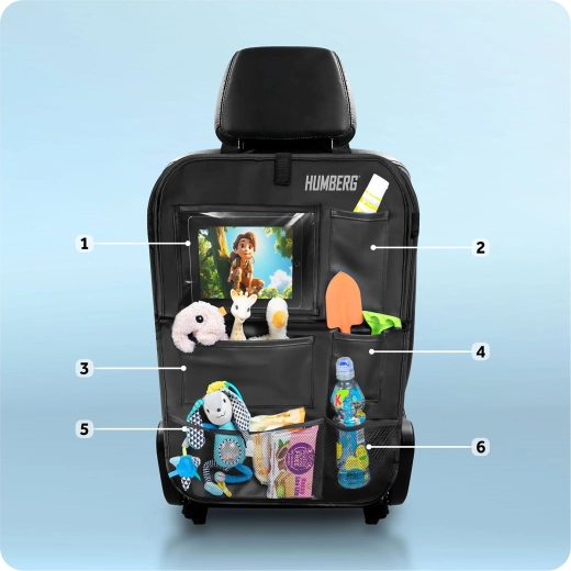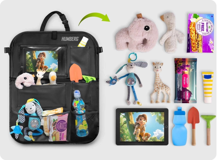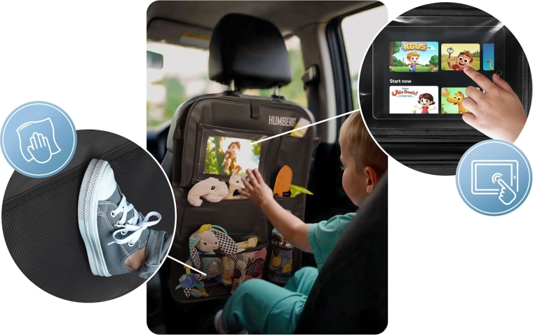 Udržujte auto přehledné a cestování s dětmi klidnější díky praktickému organizéru HUMBERG na zadní stranu sedadla. Nabízí průhlednou kapsu na tablet s dotykovou fólií, sklopný stolek na svačinu či kreslení, držák na láhev a více prostorných kapes na hračky i drobnosti. Snadná montáž, materiál lehký na čištění a ochrana čalounění před špínou od bot.