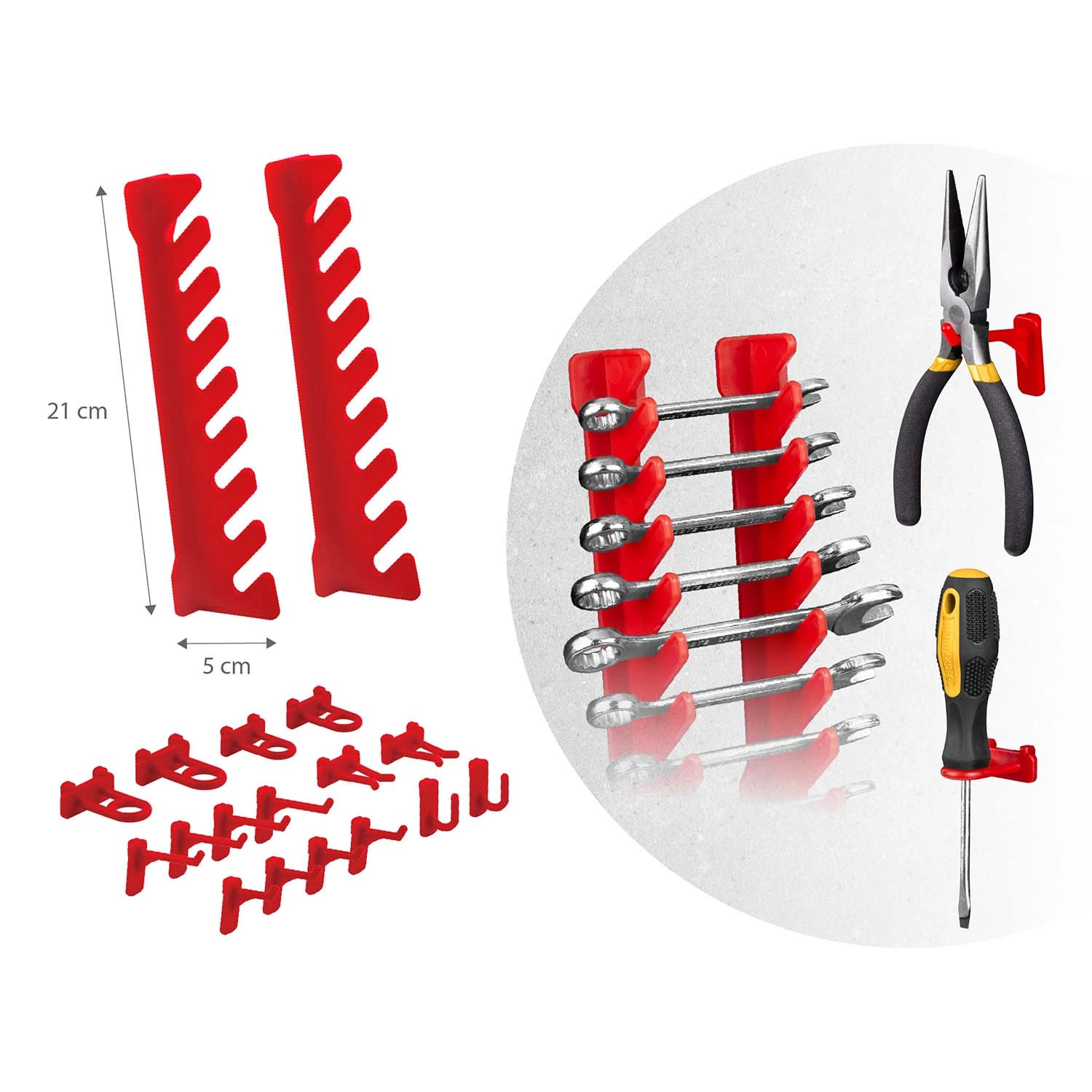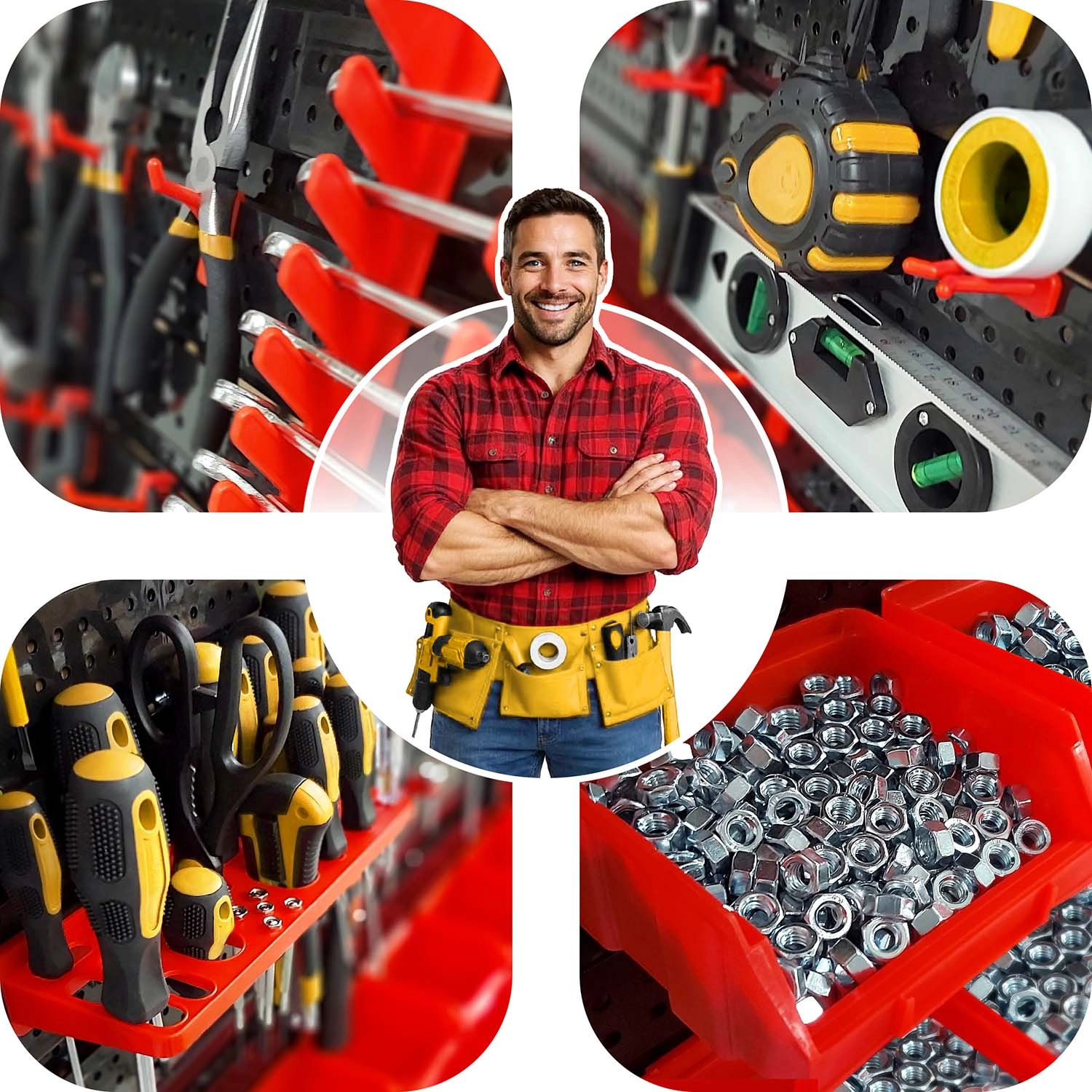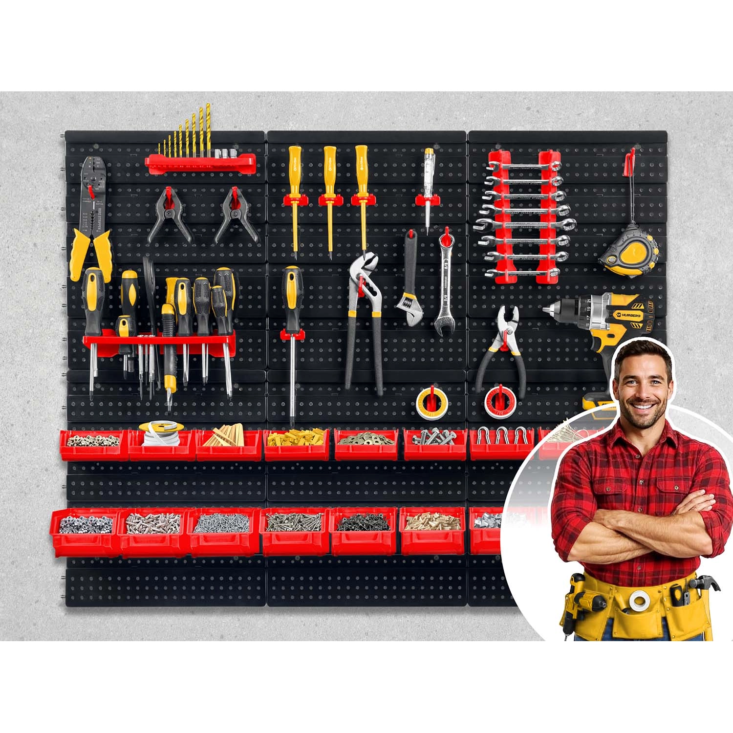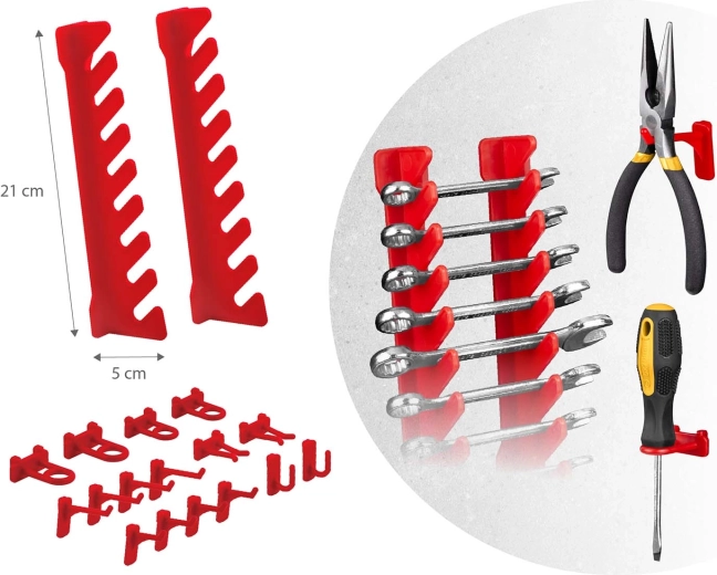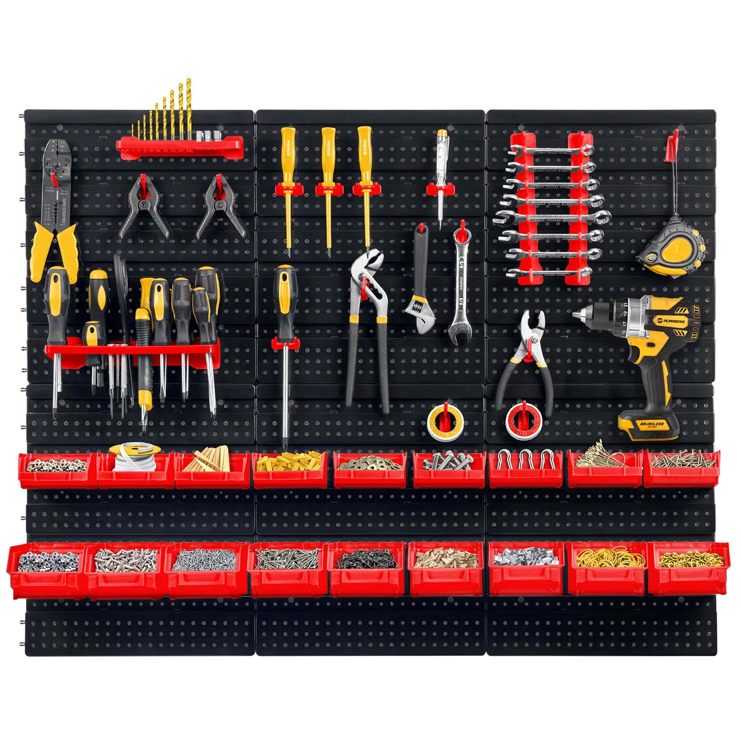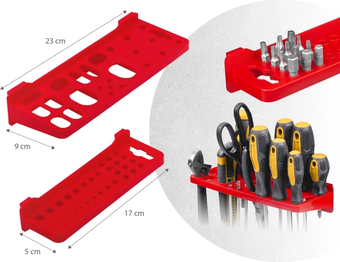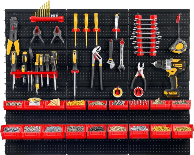 Kompletní nástěnný organizér HUMBERG je nepostradatelný pomocník pro každý servis i domácí garáž. Díky modulárnímu systému perforovaných panelů si snadno poskládáte rozvržení přesně podle svých potřeb. Pevné háčky, držáky a police udrží šroubováky, kleště i klíče, zatímco různé velikosti kuvet přehledně roztřídí spojovací materiál.