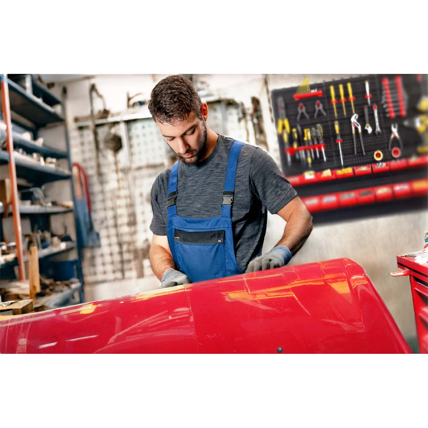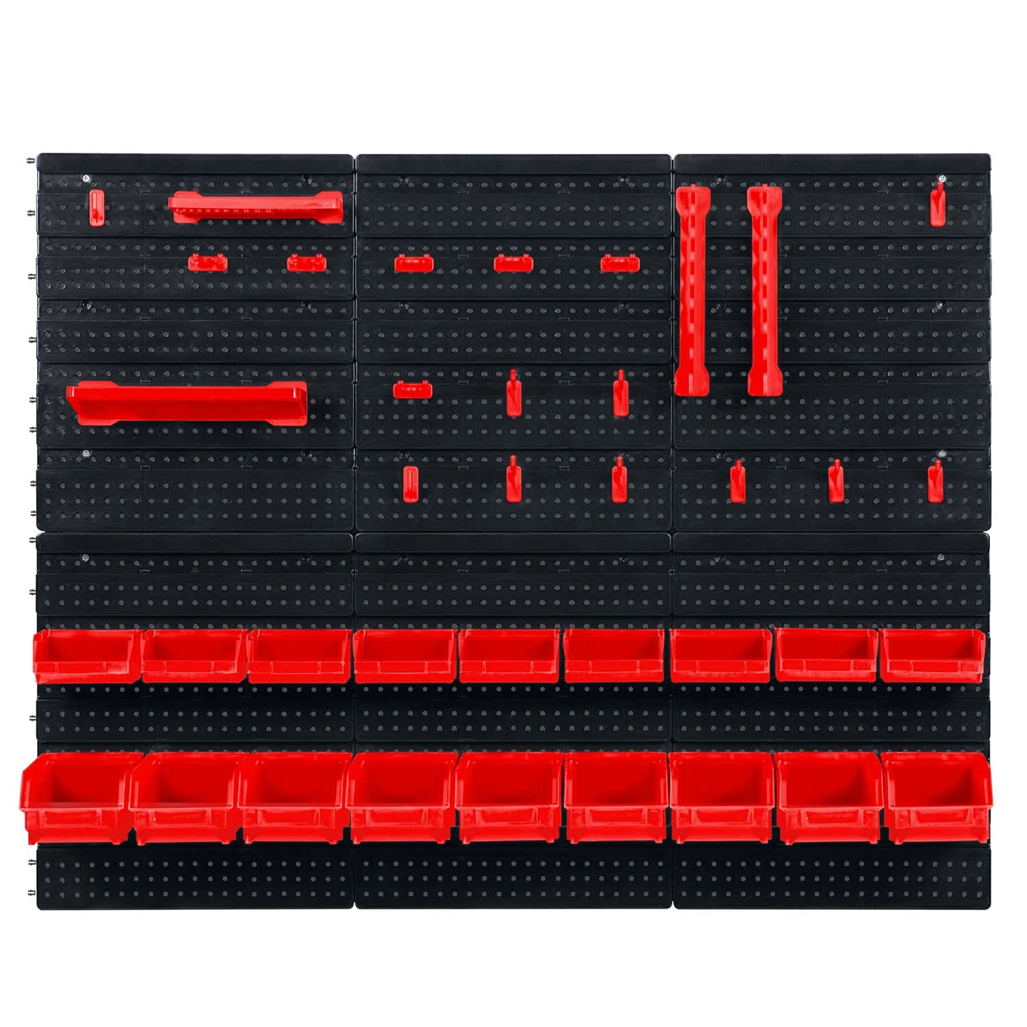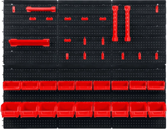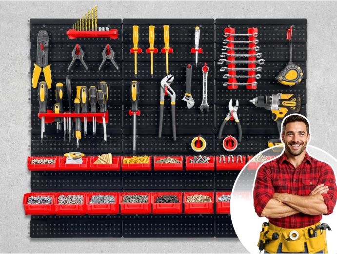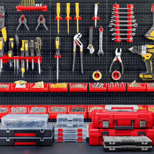 Šest perforovaných panelů a 43 doplňků vám umožní uspořádat nářadí přesně podle vašich zvyklostí – od kleští a šroubováků až po vrtáky a bity.