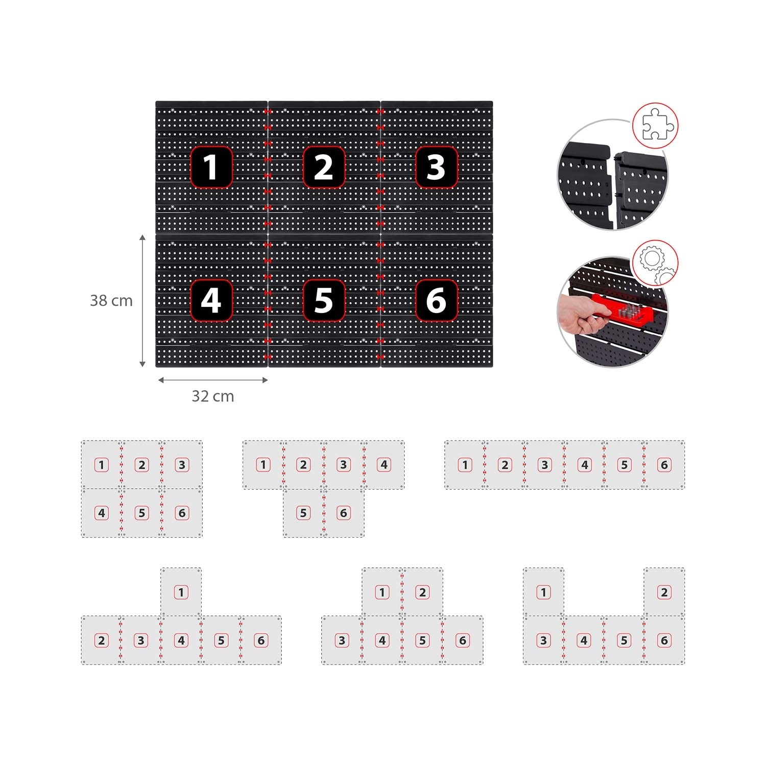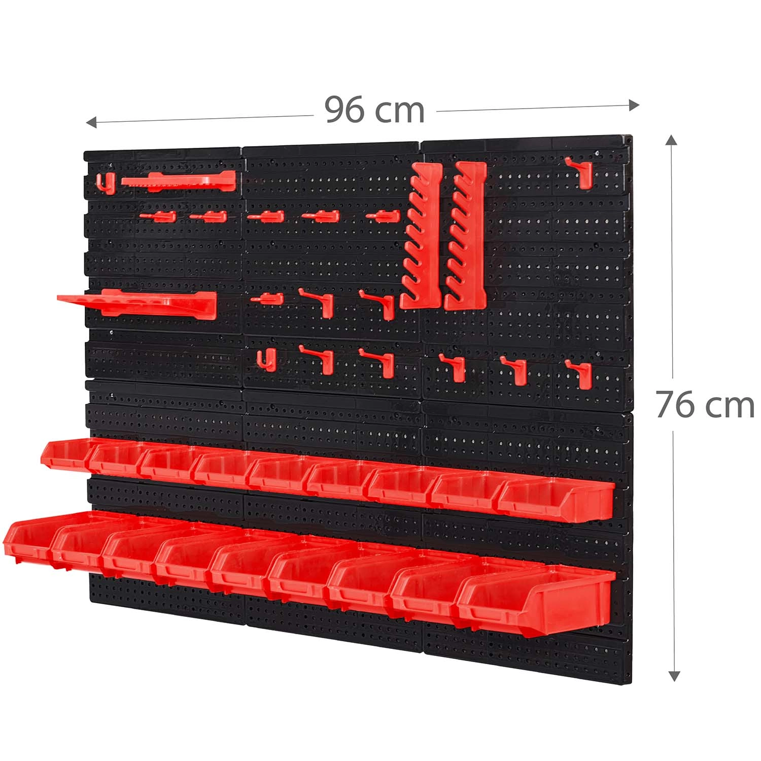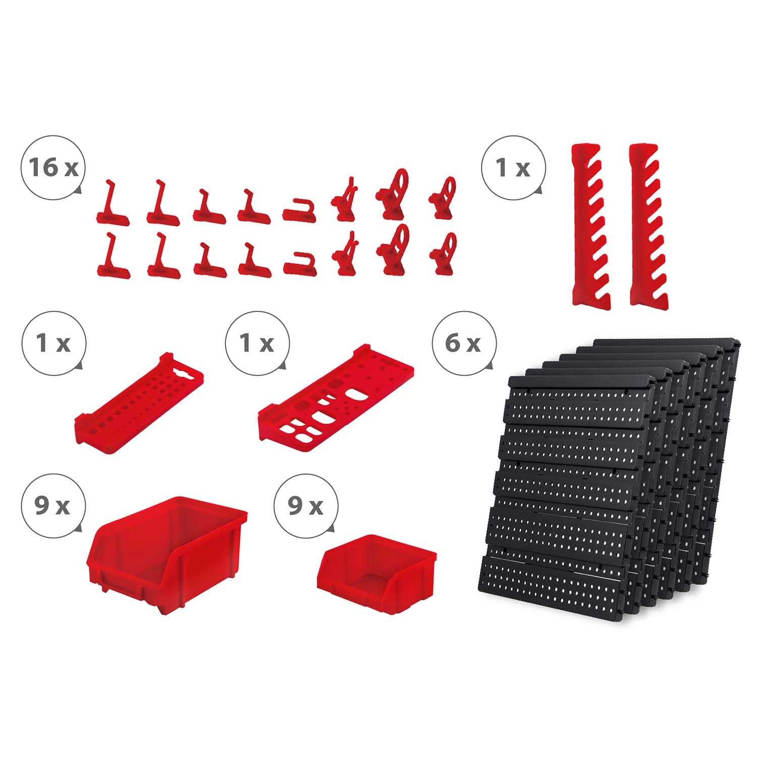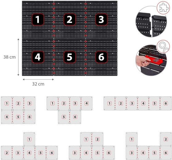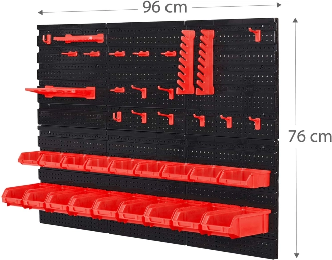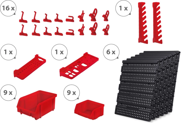 Součástí je velký set doplňků: 6 modulárních panelů a celkem 43 prvků – 18 kuvet (9 malých 9,5 × 10 × 5 cm a 9 velkých 16 × 10 × 7,3 cm), 2 odkládací police (23 × 9 cm a 17 × 5 cm), 16 háků a držáků a 1 sada držáků na klíče. Univerzální hmoždinky pro montáž do betonu, cihly, dřeva i plechu jsou v balení.