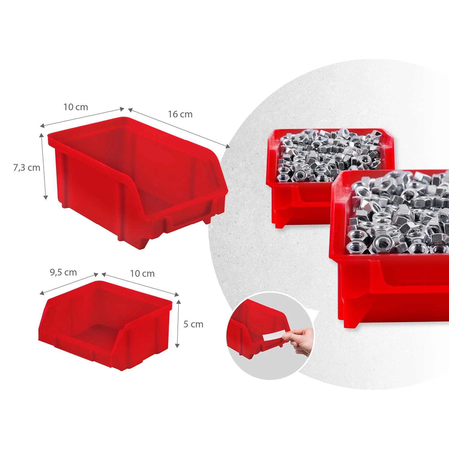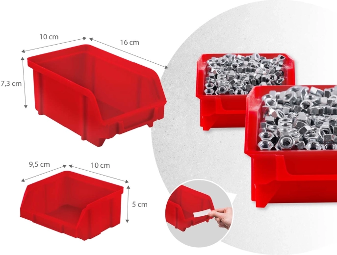 18 kuvet ve dvou velikostech, dvě odkládací police a sada háků a držáků zajistí přehledné třídění spojovacího materiálu i bezpečné uložení nářadí.