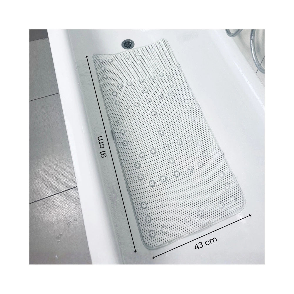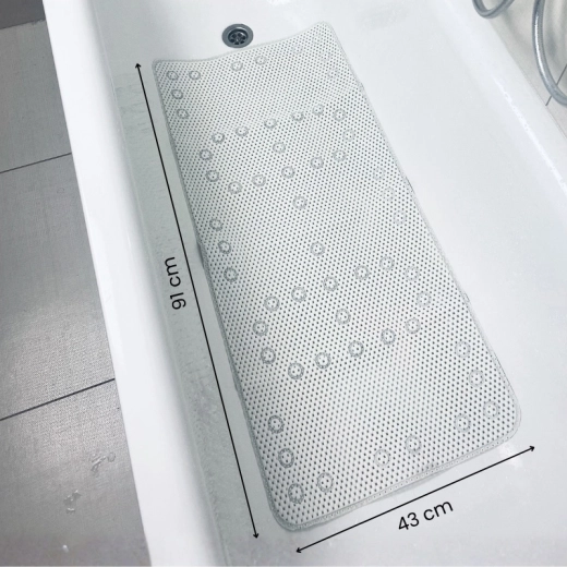 Rozměr 91 × 43 cm pokryje téměř celé dno vany a poskytne stabilní oporu dětem i dospělým při koupání nebo sprchování.