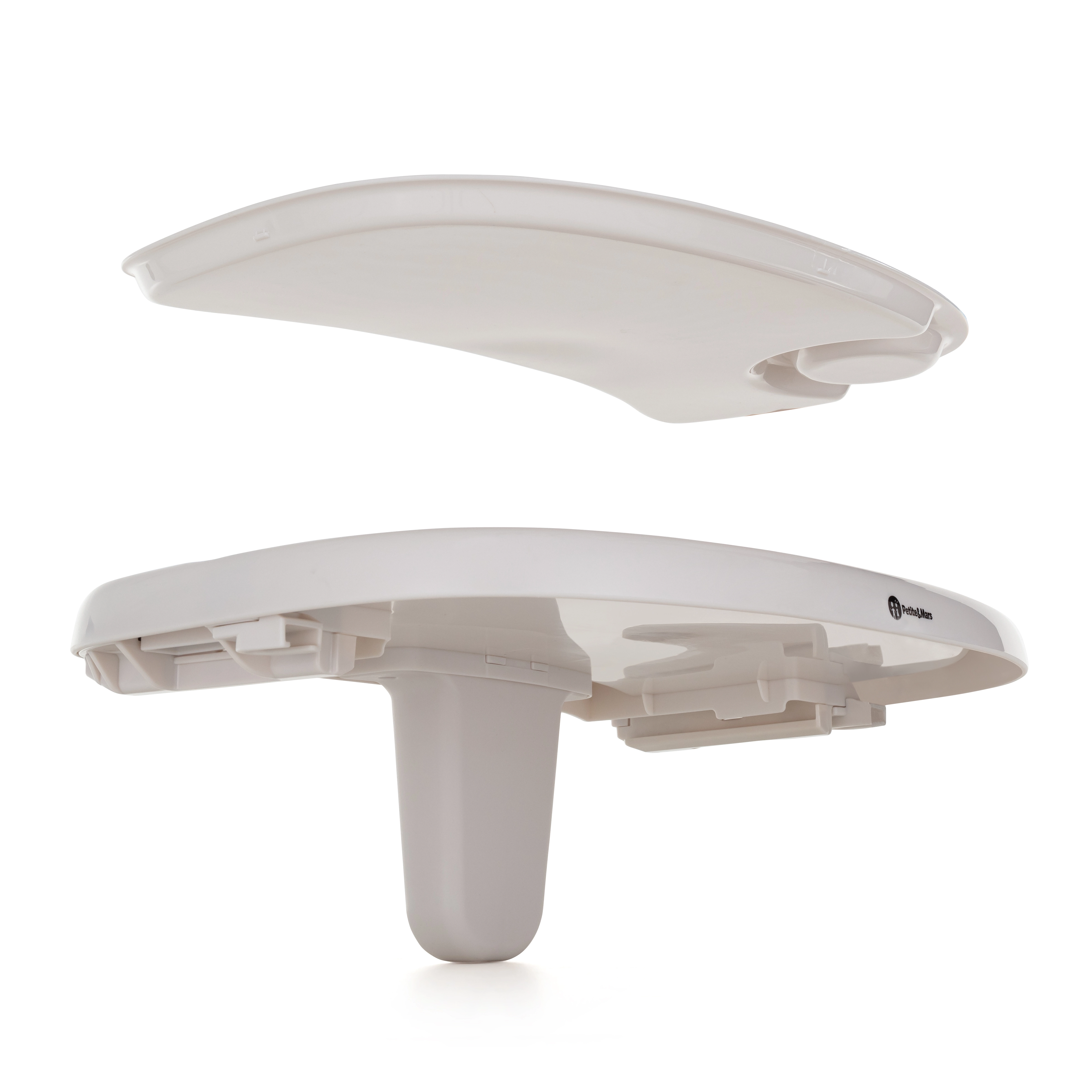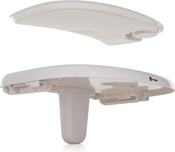 Široký podnos se skládá ze spodní a tvarované horní části s místem na kelímek; horní díl lze mýt v myčce nádobí.