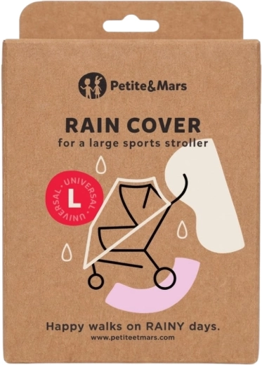 Pláštěnka PETITE&MARS Rainy Large je navržena pro prostorné sportovní kočárky, jako jsou modely STREET, STREET+/2, ROYAL nebo VALCO. Je vyrobena z měkké a odolné fólie, která se dokonale přizpůsobí tvaru kočárku a zajistí maximální ochranu před nepříznivým počasím při zachování skvělé viditelnosti na dítě.