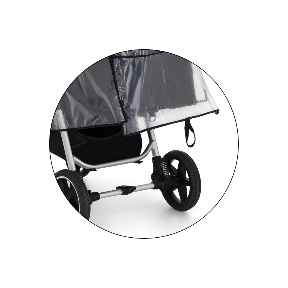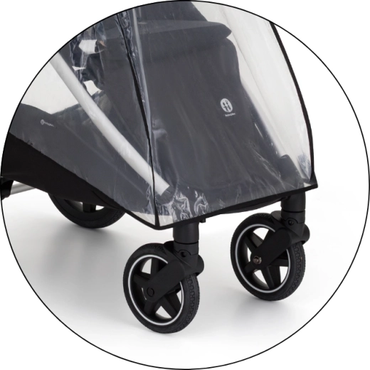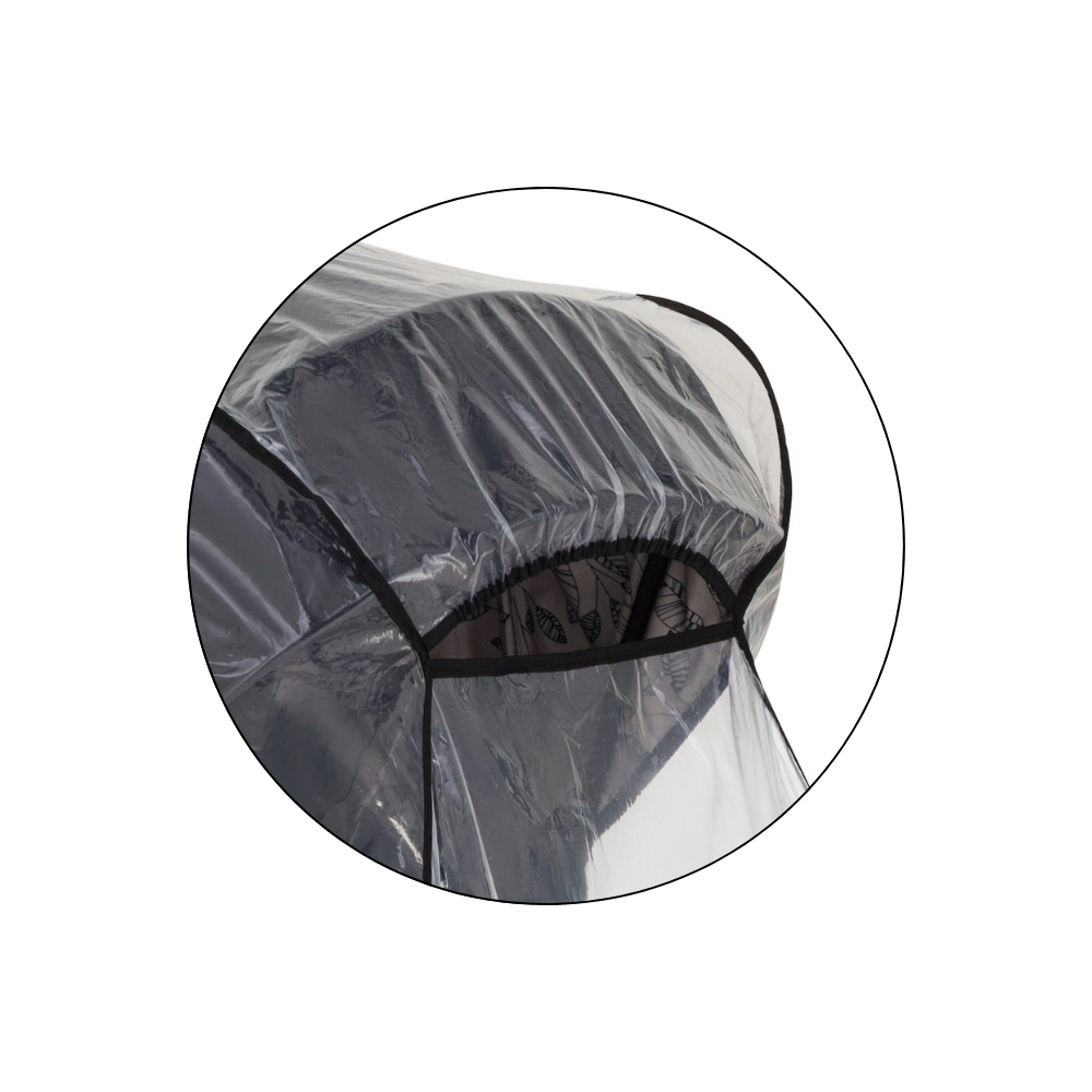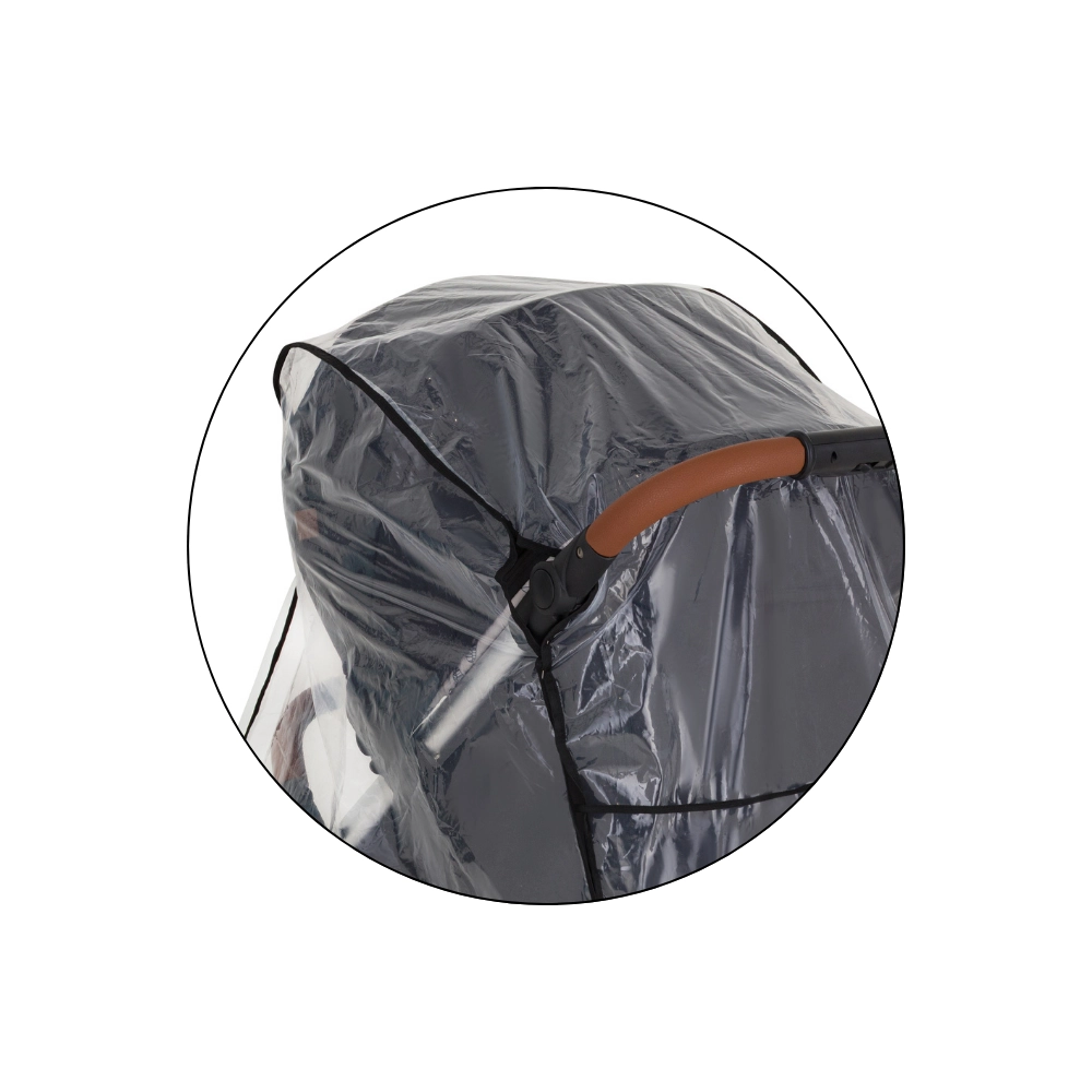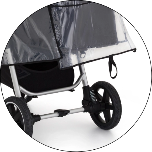 Transparentní kryt s kvalitním lemováním chrání dítě i kočárek, zároveň zachovává perfektní výhled a dohled rodiče.