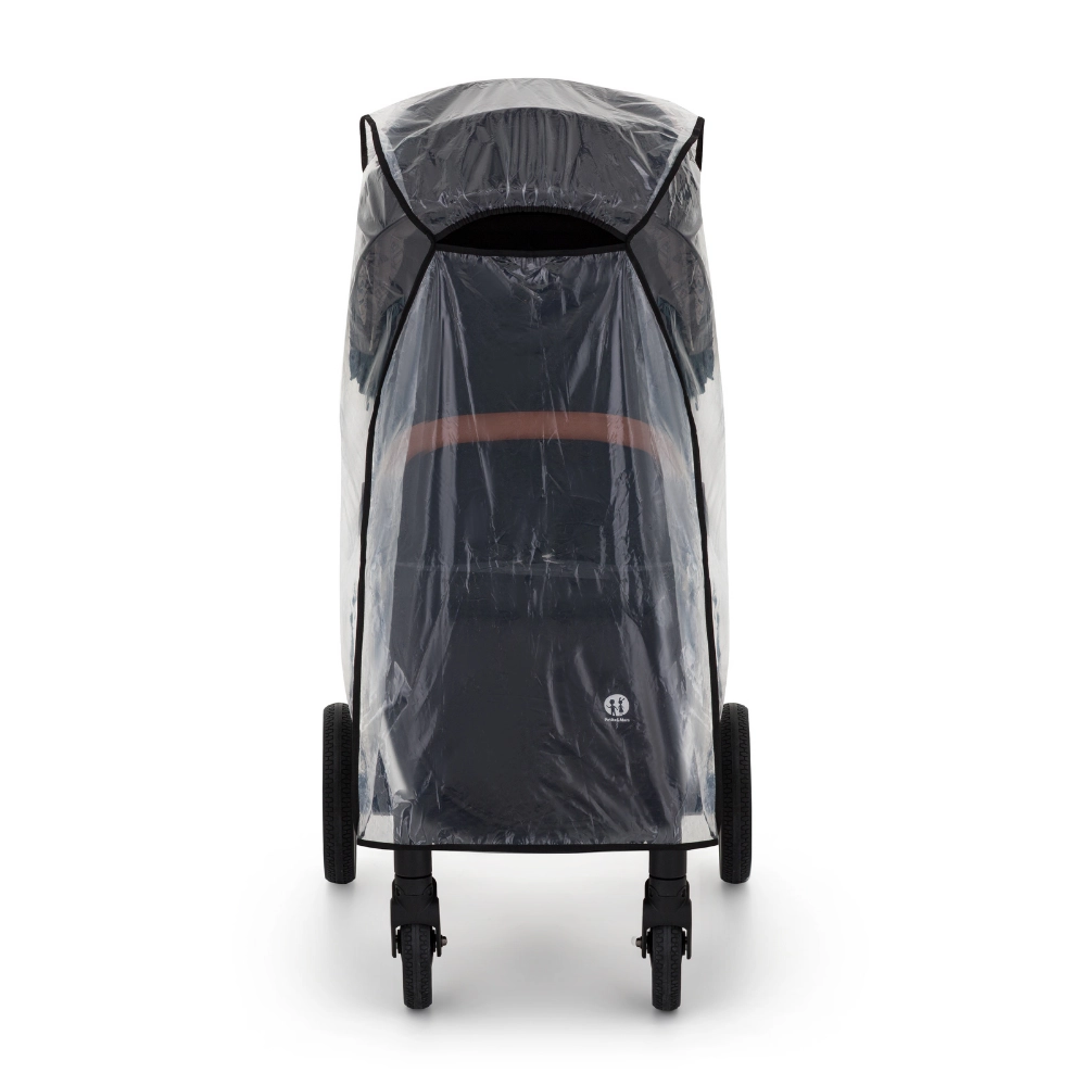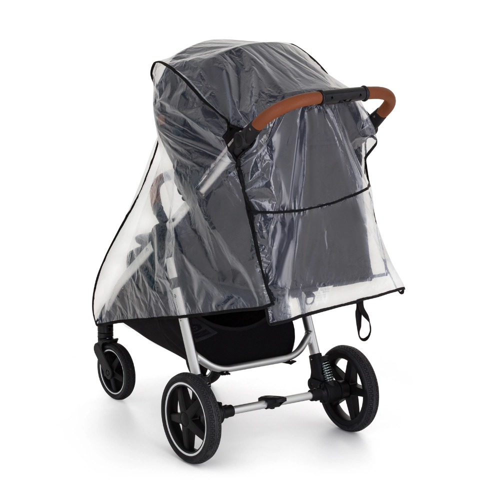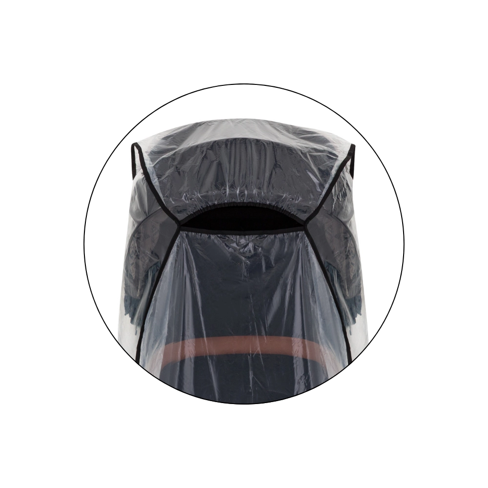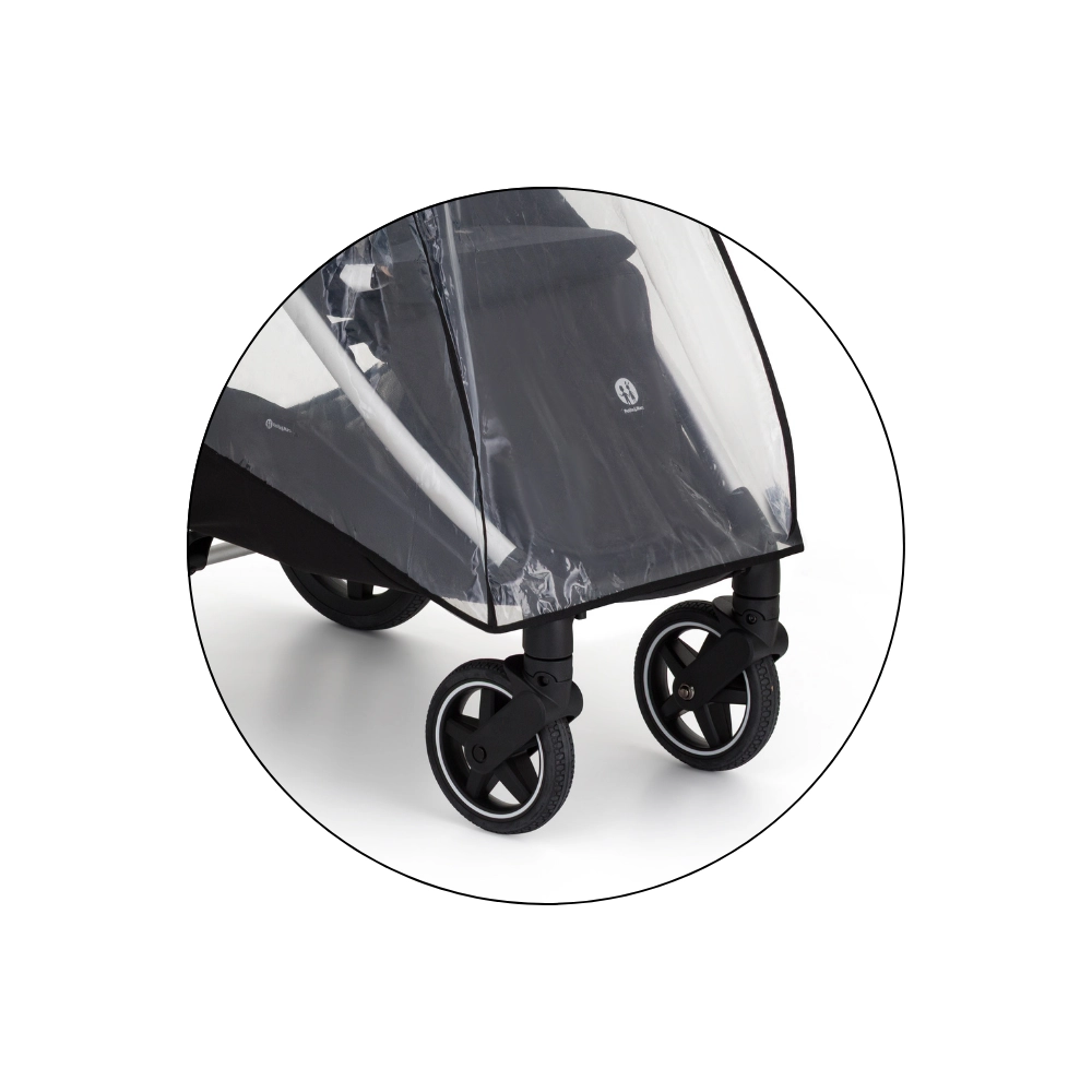 Transparentní kryt s kvalitním lemováním chrání dítě i kočárek, zároveň zachovává perfektní výhled a dohled rodiče.