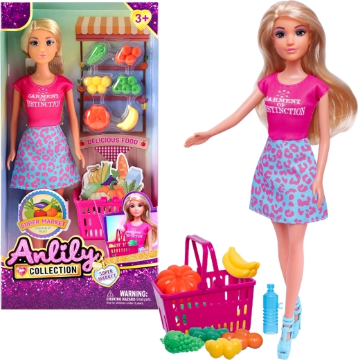 Tato půvabná panenka v krásném oblečení je připravena na nákupy v barevném stánku s ovocem a zeleninou. Děti mohou nakupovat, třídit a přenášet potraviny v prostorném košíku, přičemž si přirozeně osvojují základní principy zdravého stravování.