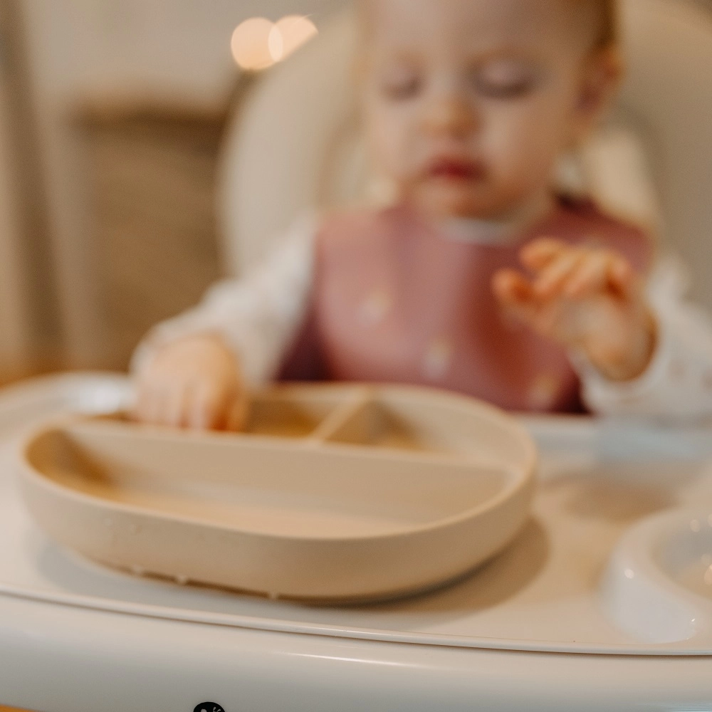 Praktický dětský talíř z potravinářského silikonu s třemi přihrádkami a silnou protiskluzovou přísavkou pro bezpečné samostatné papání. Je bez BPA, vhodný do mikrovlnky, myčky i pro uchování v lednici. Ergonomický tvar s zaoblenými okraji usnadňuje nabírání a podporuje rozvoj jemné motoriky už od 6 měsíců.