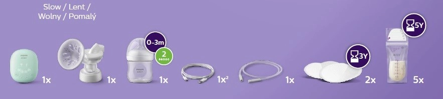 - Praktická výbava: lahev Natural 125 ml, sáčky na mléko, dudlík s pomalým průtokem, prsní vložky a příslušenství pro bezpečné skladování.