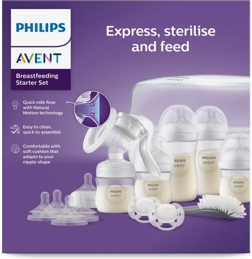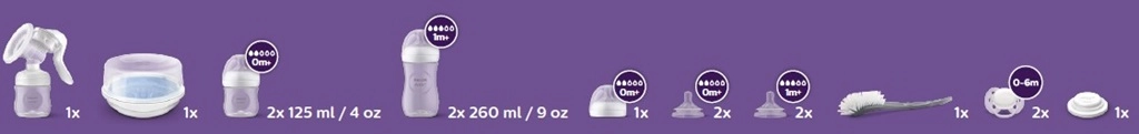 Obsah balení: 1× ruční odsávačka mateřského mléka; 1× mikrovlnný sterilizátor; 2× šidítko Ultrasoft 0–6 m; 2× savička 0 m+; 2× savička 1 m+; 2× lahev 260 ml; 2× lahev 125 ml; 1× kartáč na lahve.