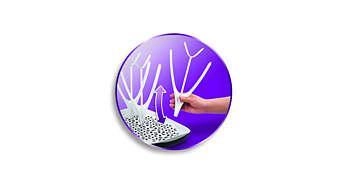 Stojan na sušení Philips Avent je navržen tak, aby zajistil rychlé a přehledné sušení všech každodenních potřeb pro krmení dítěte. Díky chytrému rozmístění kolíků pojme až 8 lahví, savičky, kroužky, díly odsávačky i další doplňky. Odnímatelný podnos zachytává odkapanou vodu a udržuje pracovní plochu suchou a čistou.