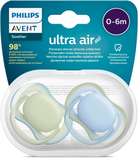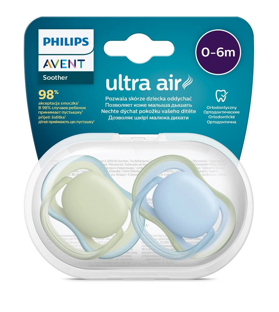 Philips Avent Ultra Air je navrženo pro šetrné zklidnění a zdravější pokožku miminka. Extra velké otvory ve štítku zajišťují vyšší cirkulaci vzduchu, díky čemuž zůstává pokožka kolem úst sušší a méně podrážděná. Lehká konstrukce a ergonomický kroužek usnadňují manipulaci a připevnění.
