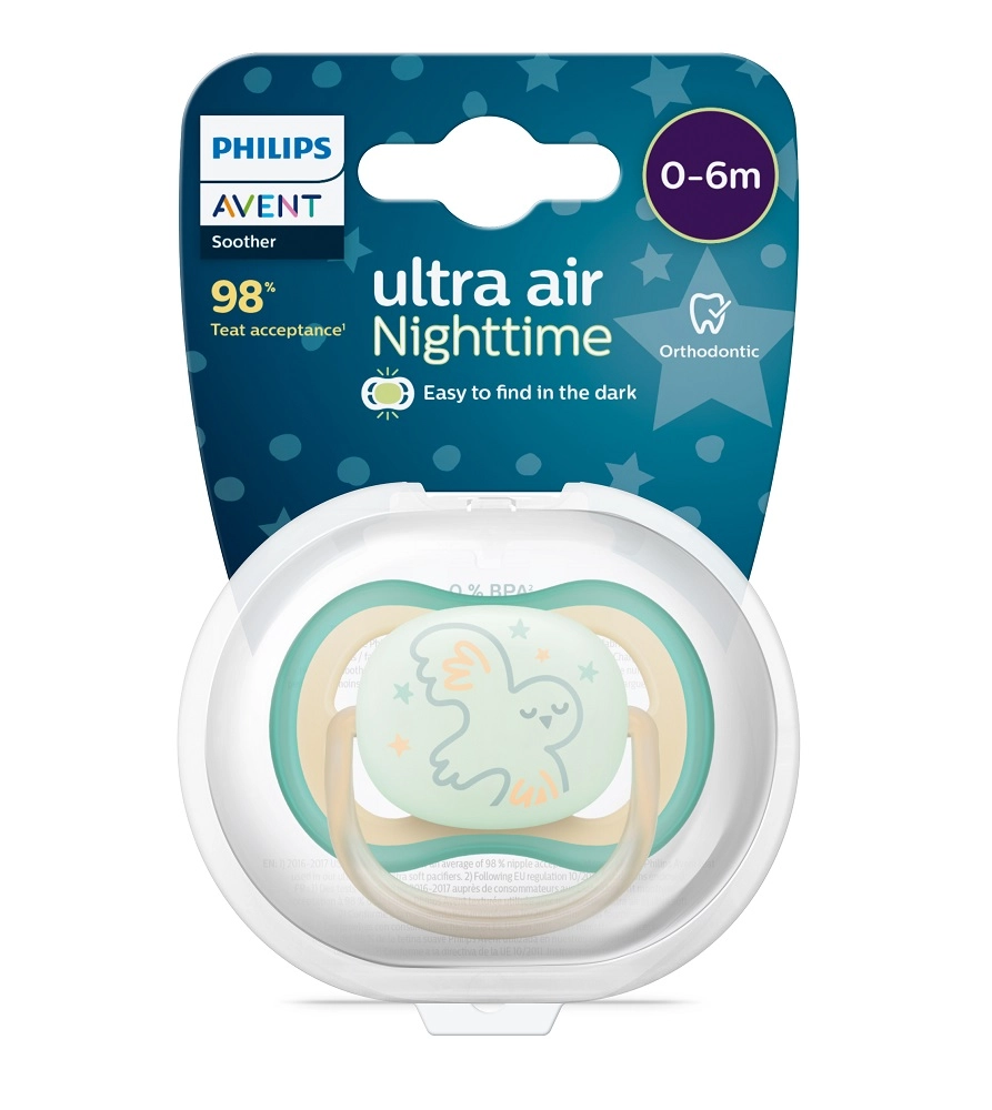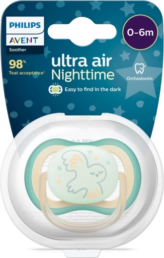 PHILIPS AVENT Ultra Air noční je lehké a šetrné šidítko navržené pro maximální komfort miminka od 0 do 6 měsíců. Díky extra velkým ventilačním otvorům zůstává pokožka miminka sušší, což snižuje podráždění. Světélkující střed pomáhá rodičům šidítko ve tmě snadno najít a nerušit tak spánek dítěte.