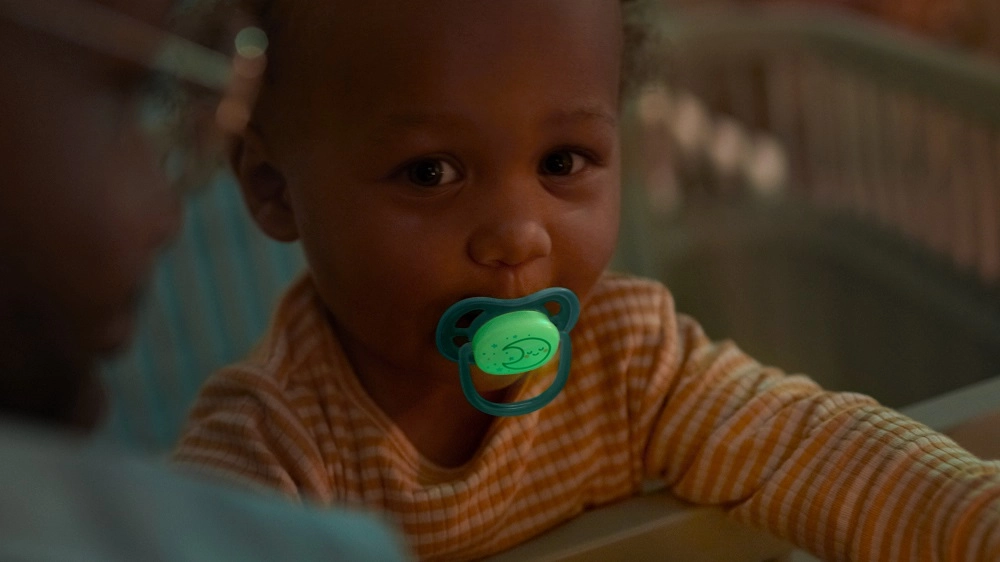 Světélkující střed šidítka zajistí rychlé a tiché nalezení v noci – bez rozsvěcení a rušení spánku.