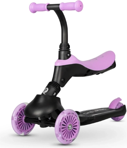 Díky rychlé přeměně bez nářadí snadno odejmete sedlo i rodičovskou rukojeť a z odrážedla se stane svižná koloběžka. LED přední kola zvyšují viditelnost a zábavu, zatímco zadní blatníková brzda poskytuje spolehlivé zastavení. Skládací konstrukce šetří místo doma i v kufru auta.
