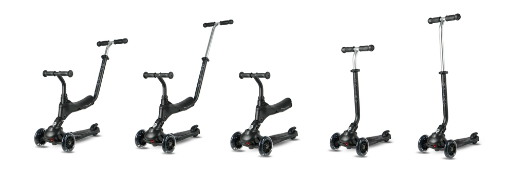 Pět konfiguračních stupňů pokryje celé období učení – od jízdy v sedě s rodičovským madlem až po samostatné ježdění na koloběžce.