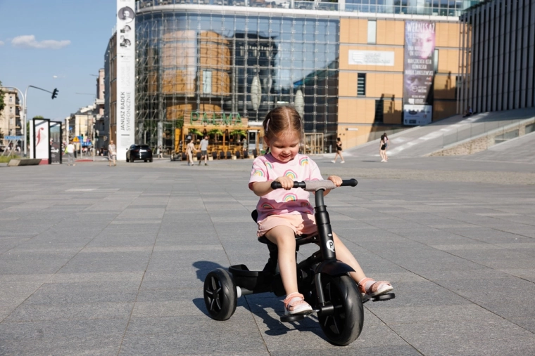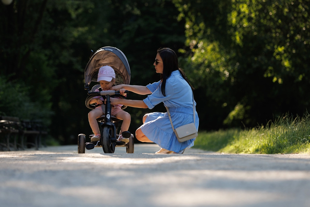 Bezpečí je na prvním místě: 5bodové pásy, odnímatelná ochranná tyč a rozšířitelná stříška s UV ochranou UPF 50+ chrání dítě za všech podmínek. Funkce volnoběhu a uzamykání řízení umožní přechod od asistované jízdy k samostatnému šlapání, zatímco sklopná opěrka nohou poskytne odpočinek při delších vycházkách.
