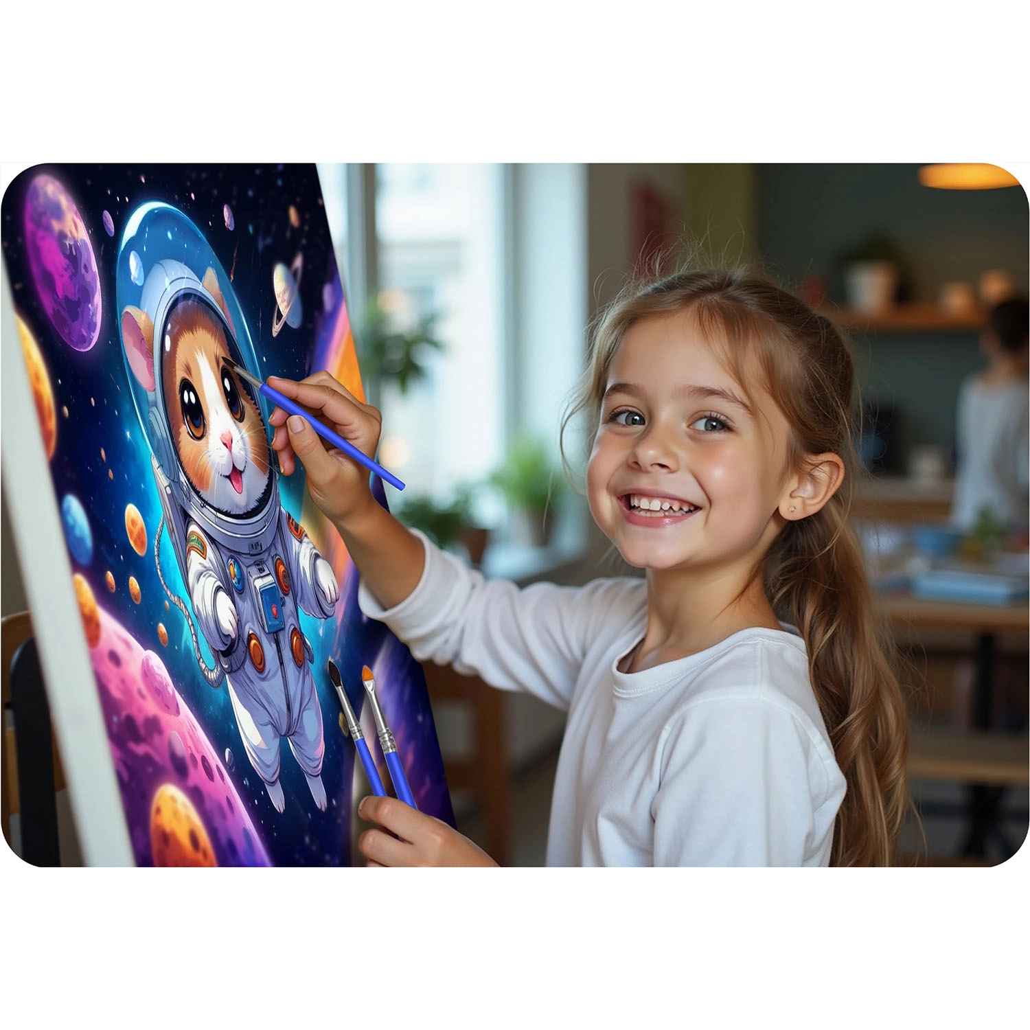Objevte radost z tvorby s kreativní sadou malování podle čísel na plátně 40 × 50 cm. Vzor Astronaut okouzlí děti i dospělé, plátno na rámu je předem připravené k malování, v balení najdete až 30 krycích barev, 3 štětce různé tloušťky a háčky na zavěšení. Ideální pro začátečníky i pokročilé – stačí postupovat podle čísel a vytvoříte živý, barevný obraz s vesmírným motivem.