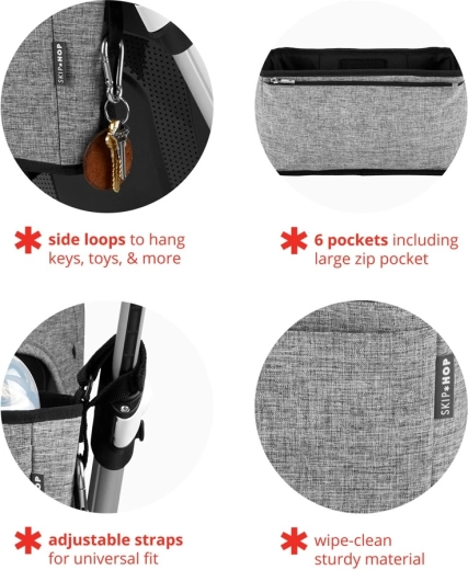 Praktický organizér na kočárek Skip Hop Grab & Go Ultra ve stylovém šedém melange provedení nabízí šest kapes, velkou kapsu na zip a boční poutka na klíče či hračky. Díky nastavitelným popruhům jej snadno připevníte k většině kočárků a pevný, snadno omyvatelný materiál udrží vše v bezpečí a na dosah ruky.