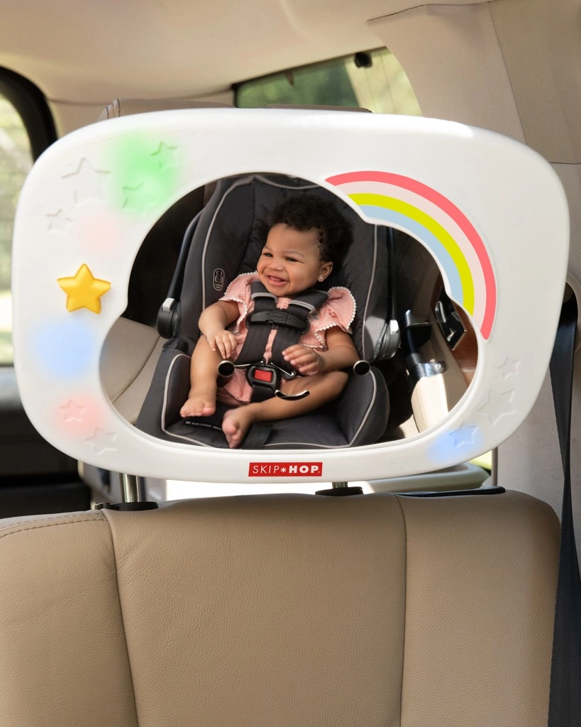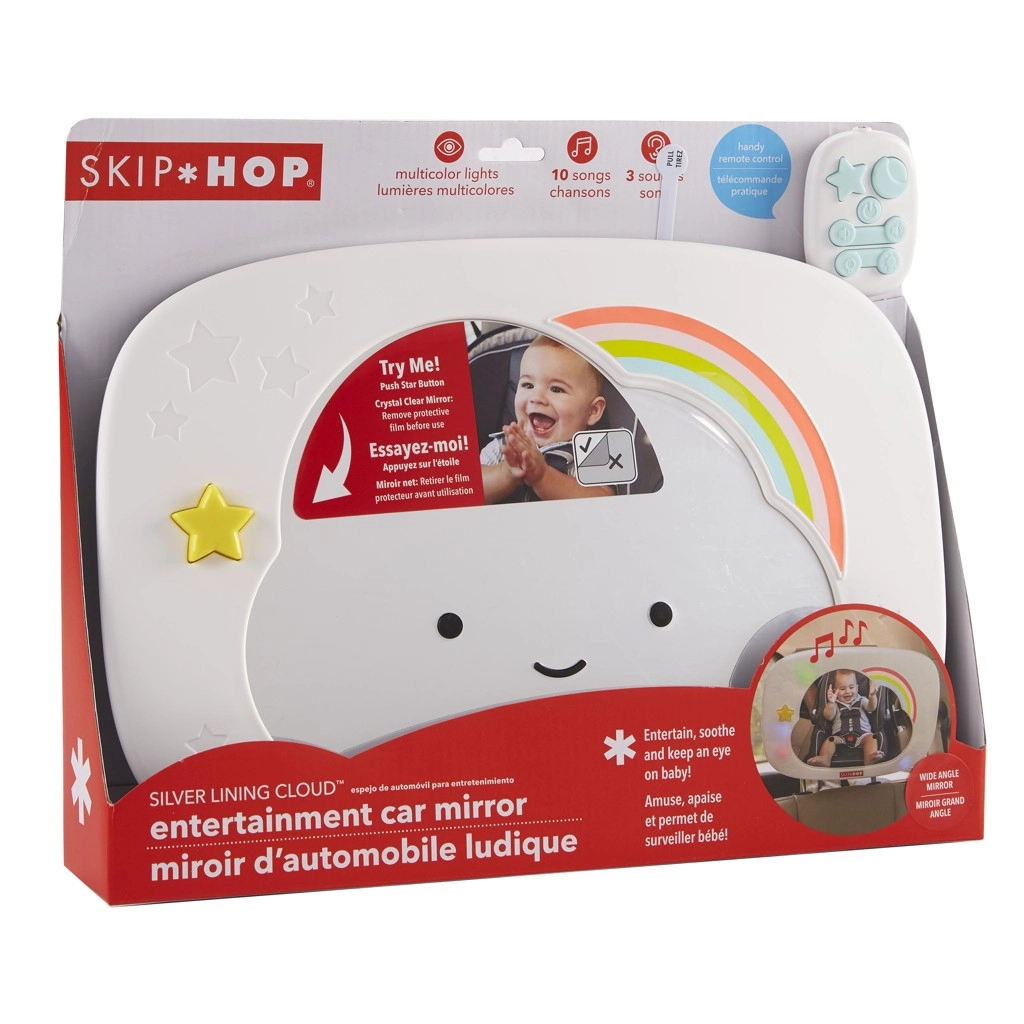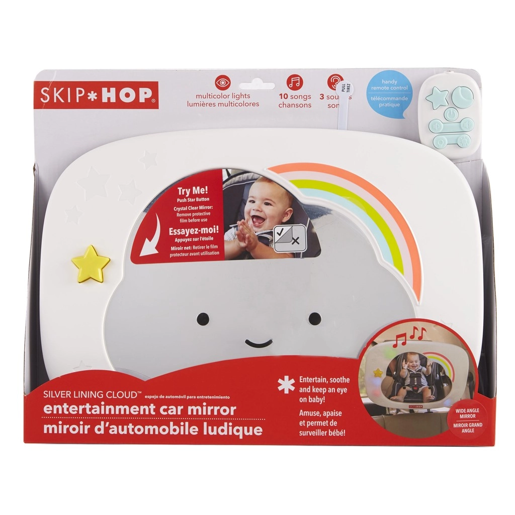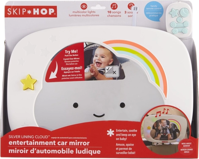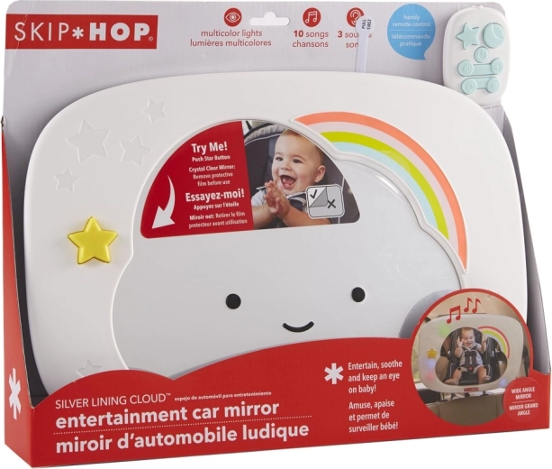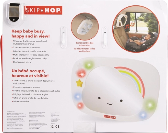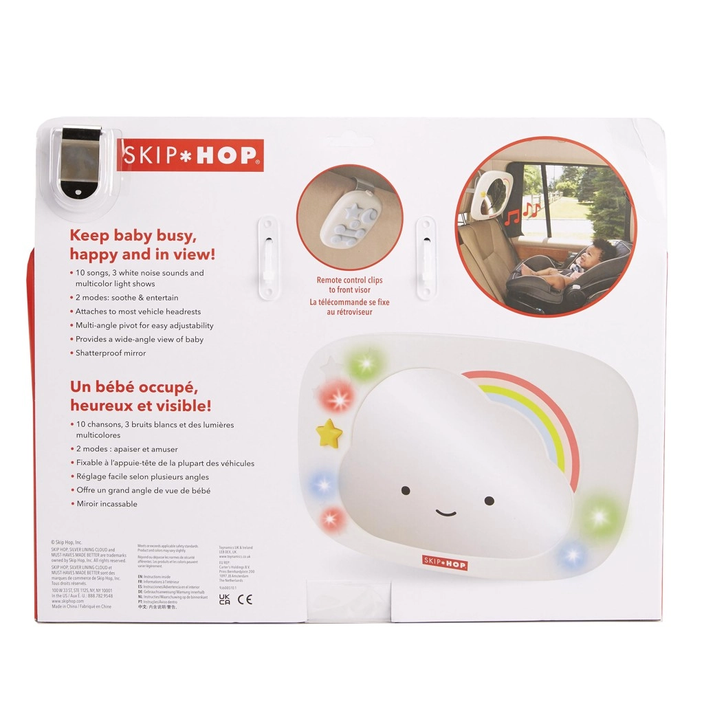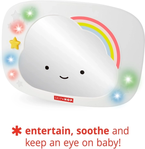 Roztomilé autosedačkové zrcátko ve tvaru obláčku od SKIP HOP pomáhá rodičům mít přehled o miminku a zároveň jej zabavit i uklidnit. Nabízí vícebarevná LED světla, hudbu a bílý šum, dálkové ovládání s klipem a široký úhel záběru díky velké, zakřivené ploše zrcadla a víceúhlovému čepu.