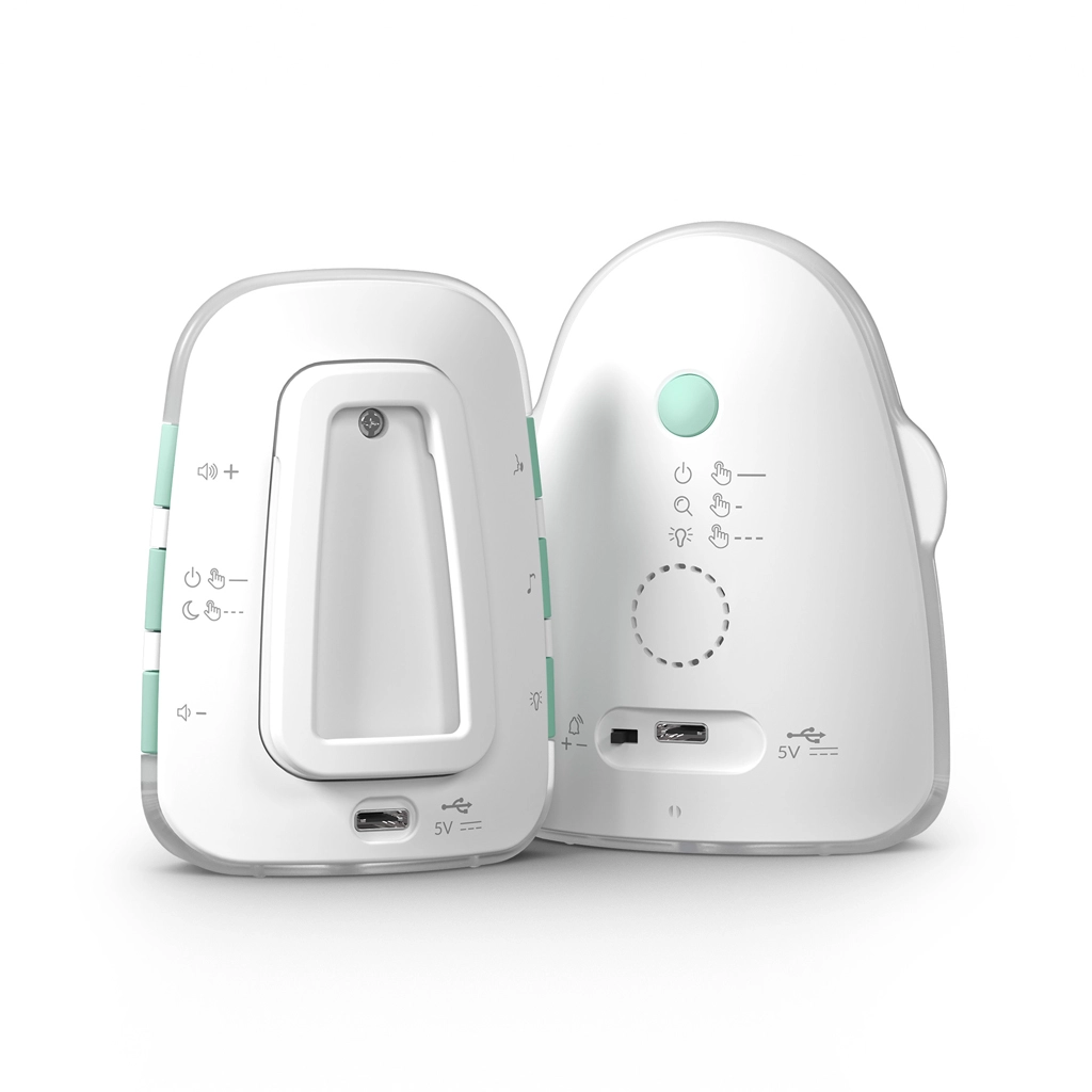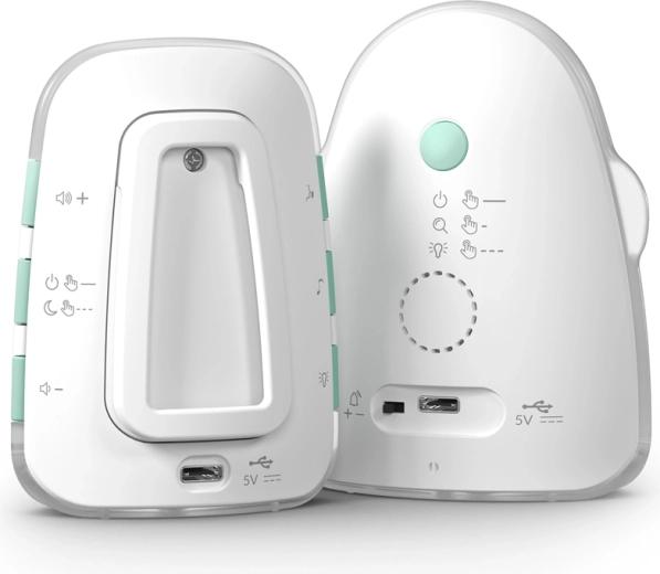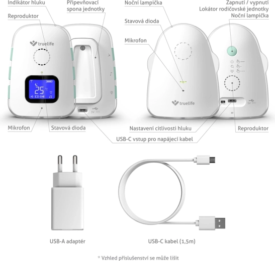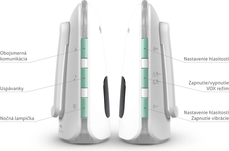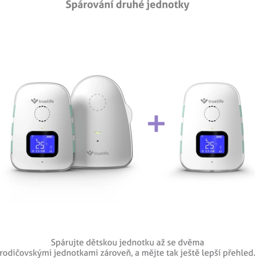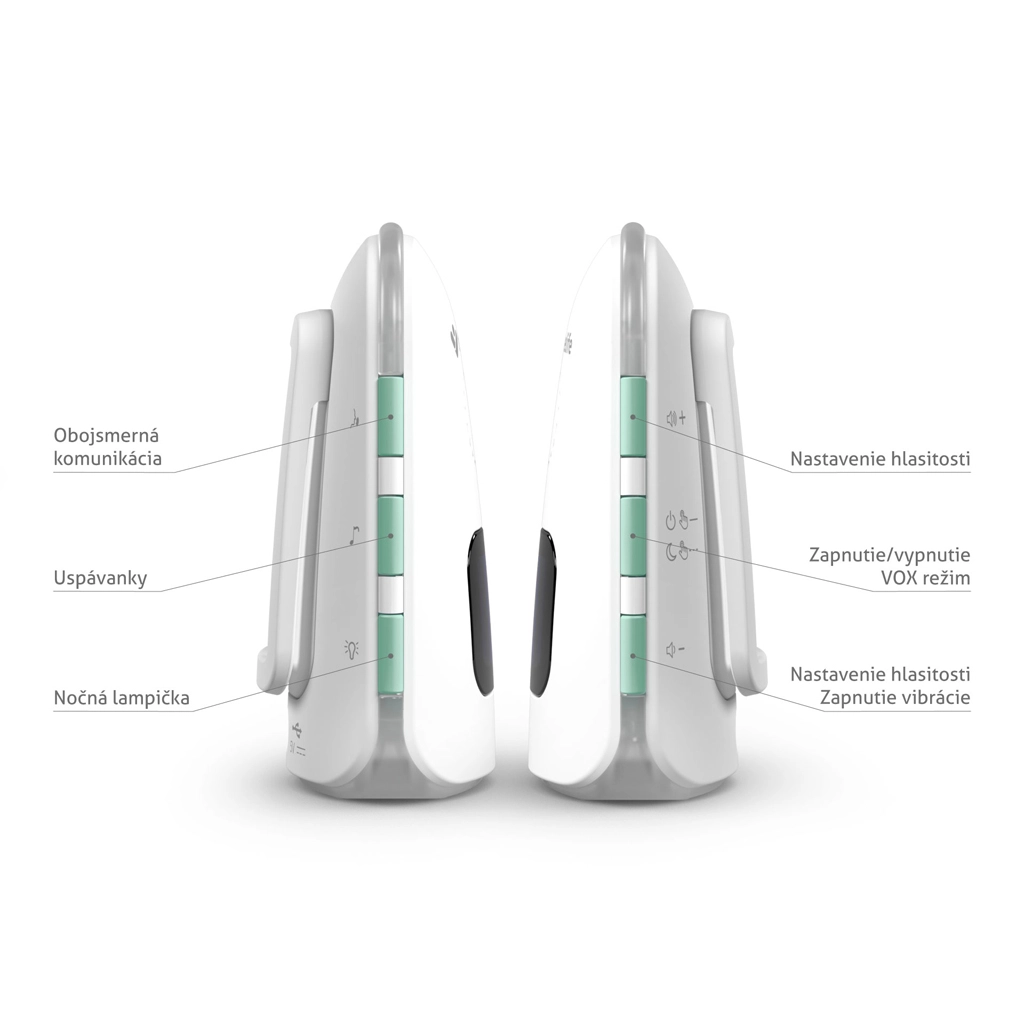 Rodičovská jednotka s LCD displejem zobrazuje teplotu, stav baterie a sílu signálu. Nechybí teplotní hlídání s upozorněním na nízkou či vysokou teplotu, tichý režim s vibracemi, praktická noční lampička a zvukový lokátor rodičovské jednotky. Obě jednotky mají integrované baterie s dlouhou výdrží a pohodlné nabíjení přes USB‑C, případně z powerbanky.