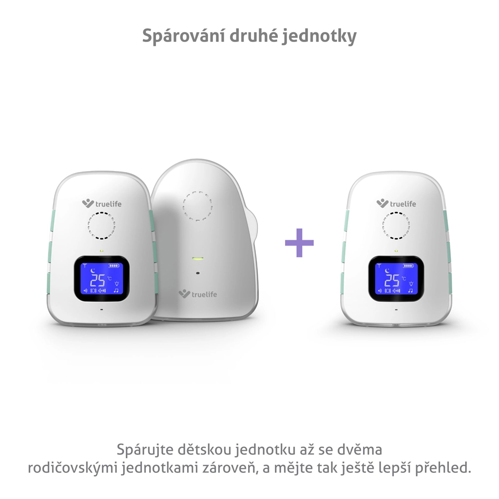 TrueLife NannyTone VM3 je spolehlivá digitální audio chůvička pro nerušený přehled o dění v dětském pokojíčku. Stabilní a bezpečný přenos zvuku s dosahem až 800 m v otevřeném prostoru a až 300 m v budově doplňuje citlivý VOX režim, který chůvičku aktivuje jen při zachycení zvuku a šetří tak baterii. Díky obousměrné komunikaci můžete miminko uklidnit na dálku a zvolit z 8 ukolébavek s nastavitelnou hlasitostí.