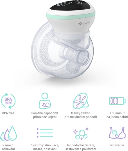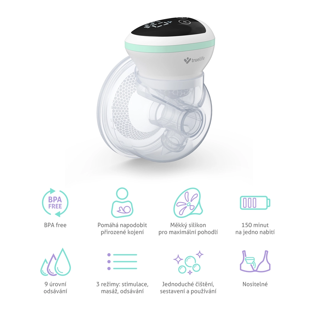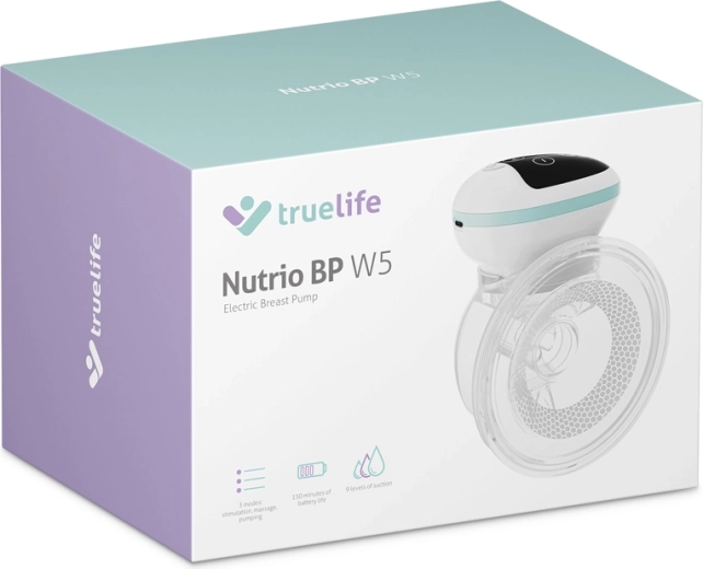 TrueLife Nutrio BP W5 je moderní elektrická handsfree odsávačka, která přirozeně podporuje laktaci. Tři chytré režimy – stimulace pro rozproudění toku mléka, jemná masáž pro uvolnění a efektivní odsávání napodobující sání miminka – poskytují maximální komfort. Každý režim si snadno doladíte díky devíti úrovním intenzity.