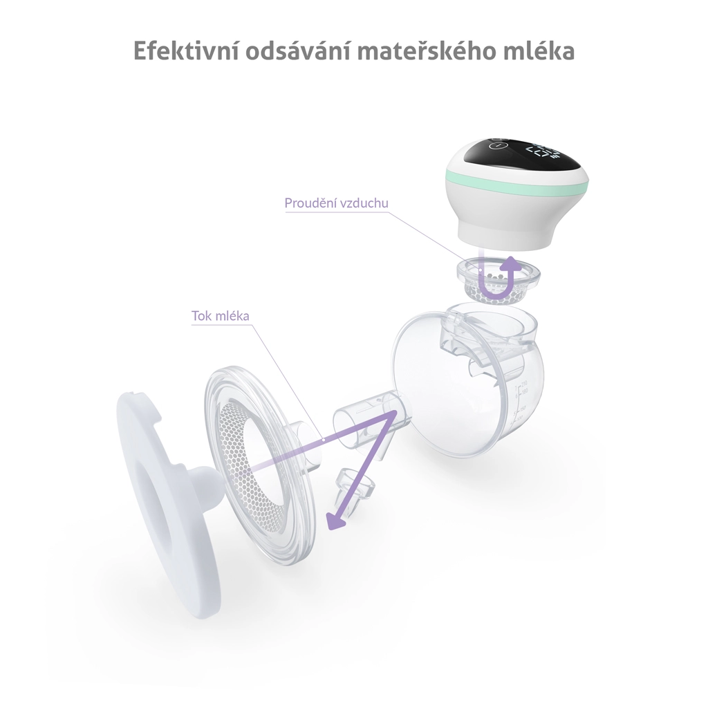 Díky integrované baterii s výdrží až 180 minut odsáváte svobodně a bez kabelů, a to i na cestách. Ergonomický tvar a měkký silikonový nástavec se dokonale přizpůsobí tvaru prsu, zatímco přehledný LED displej s časovačem hlídá délku odsávání (max. 30 minut). Mléko bezpečně stéká do vestavěného zásobníku o objemu 210 ml z materiálů bez BPA.