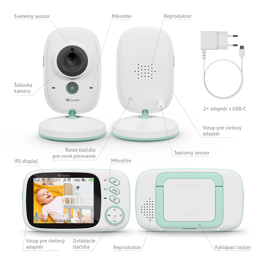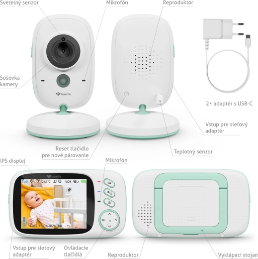 - Kamera (dětská jednotka), rodičovská jednotka, 2× adaptér s USB-C, návod