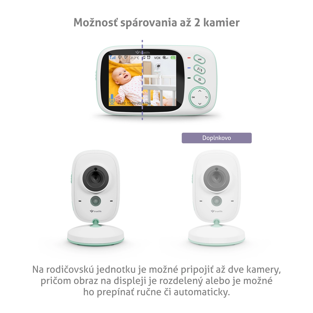 Praktický režim VOX prodlužuje výdrž baterie až na 20 hodin tím, že obrazovku probudí až při zaznamenání zvuku. Chůvička také měří teplotu v místnosti a upozorní na její změny. S robustním dosahem až 300 m na volném prostranství se můžete doma volně pohybovat. Pro větší pokrytí lze spárovat až 2 kamery a kameru naklonit podle potřeby; k postýlce lze dokoupit držák TrueLife NannyCam H32 Holder.