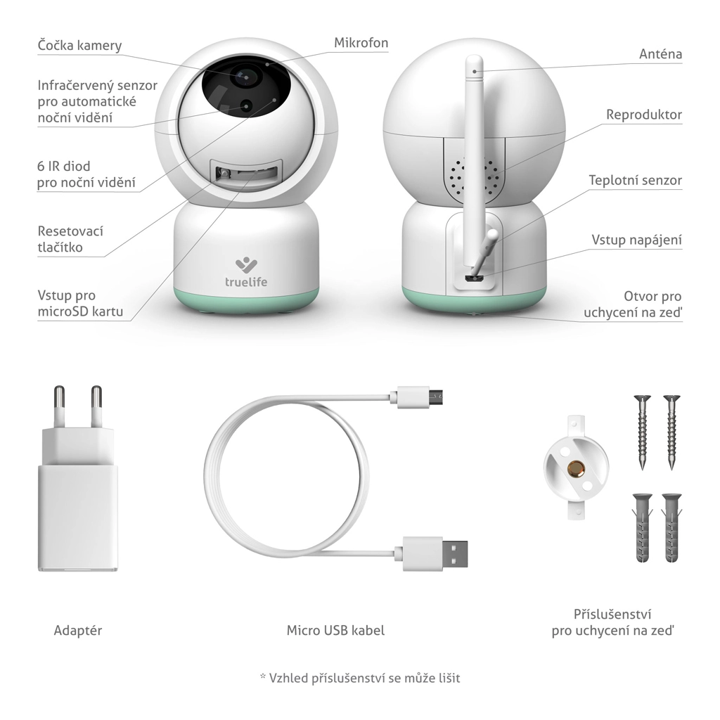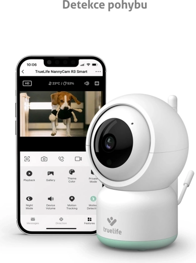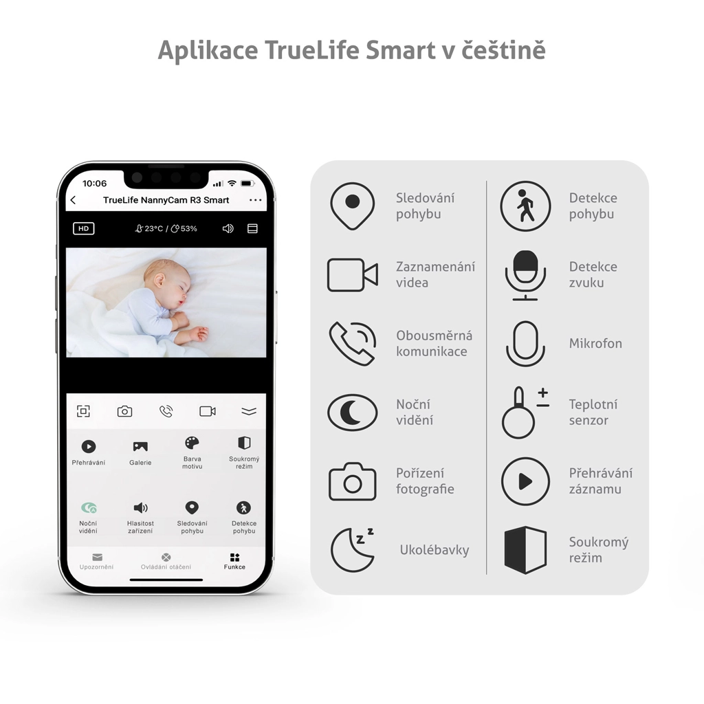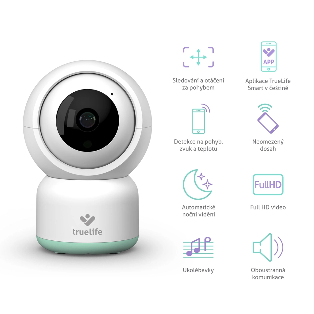 TrueLife NannyCam R3 Smart je moderní videochůvička pro klidný spánek vašeho děťátka i vaší mysli. Otočná kamera se širokoúhlou čočkou 100° a Full HD rozlišením 1080p poskytuje čistý obraz ve dne i v noci díky automatickému nočnímu vidění. Přes internet máte neomezený dosah a v aplikaci TrueLife Smart (plně v češtině) uvidíte, uslyšíte a nastavíte vše důležité – včetně upozornění na pohyb, zvuk a teplotu.