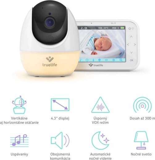 Spolehlivá video chůvička TRUELIFE NannyCam R4 Pro nabízí 360° pokrytí díky otočné kameře, 4,3" IPS displej s čistým obrazem, dosah až 300 m, automatické noční vidění, VOX režim s výdrží až 17 hodin, obousměrnou komunikaci, noční světlo, 8 ukolébavek a měření teploty. Ideální pro klidné hlídání doma i na zahradě.