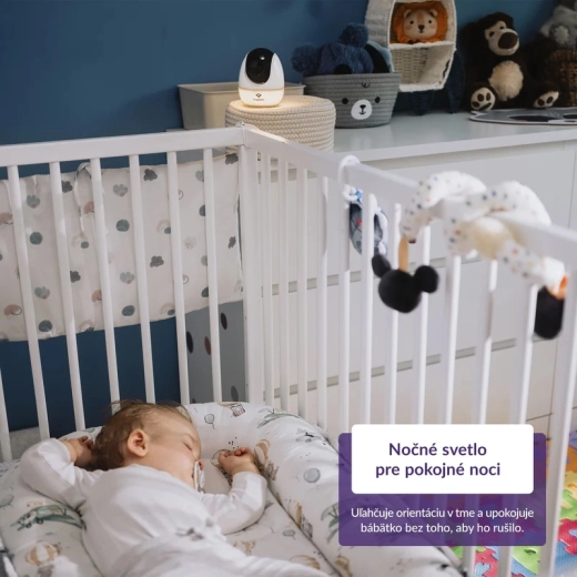 Kamera se ovládá z rodičovské jednotky a nabídne 355° horizontálně a 105° vertikálně. S nočním viděním uvidíte miminko ostře i ve tmě.