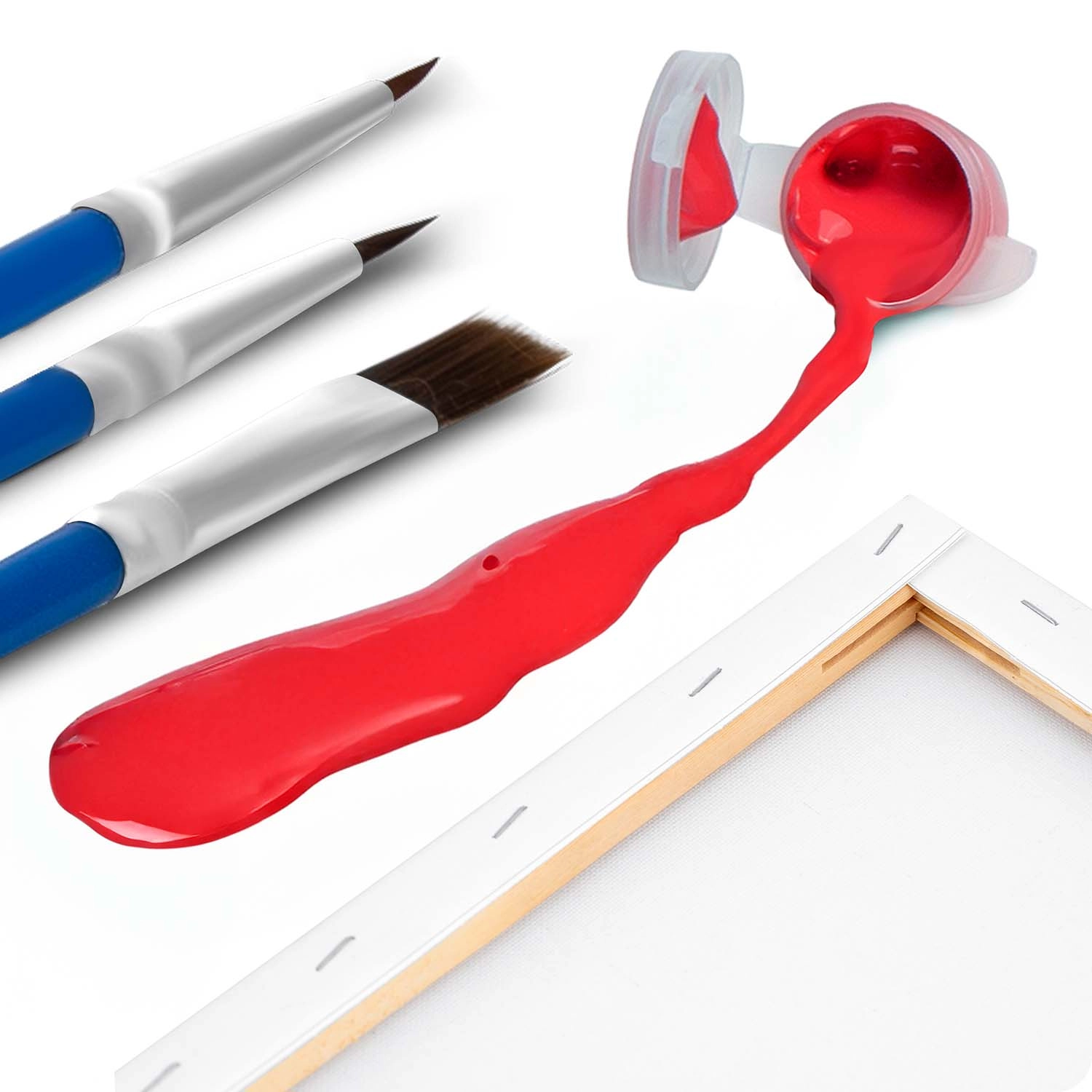 Kompletní sada pro okamžité malování – zagruntované plátno na rámu, až 30 sytých akrylových barev, 3 štětce různých velikostí a závěsný hardware.
