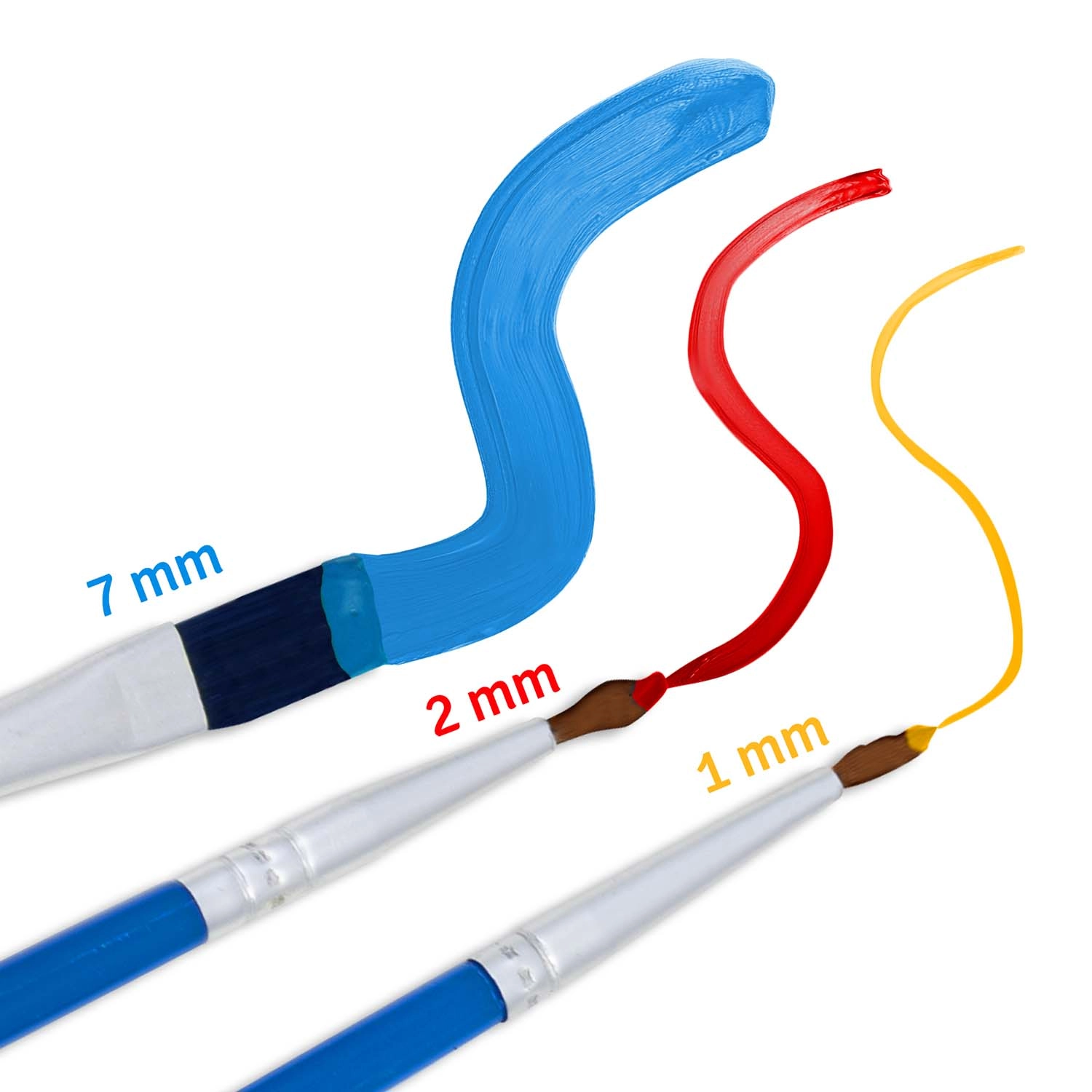 Tři štětce (1 mm, 2 mm a 7 mm) pokryjí velké plochy i nejmenší detaily. Husté, krycí barvy zajistí plné překrytí bez prosvítání linií.