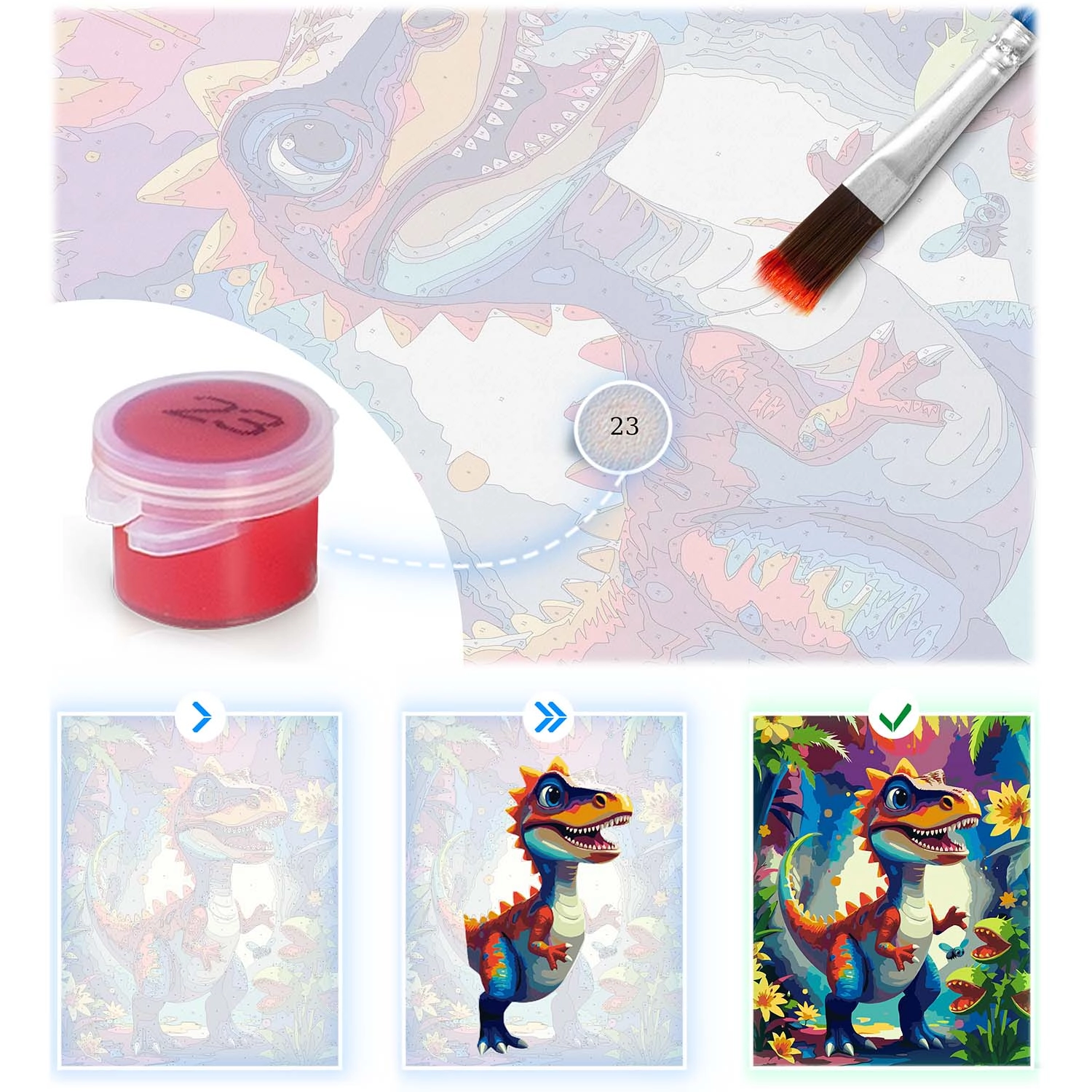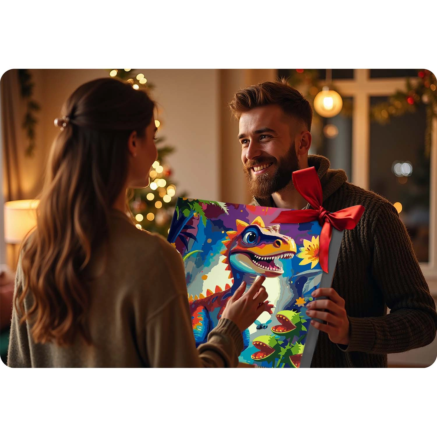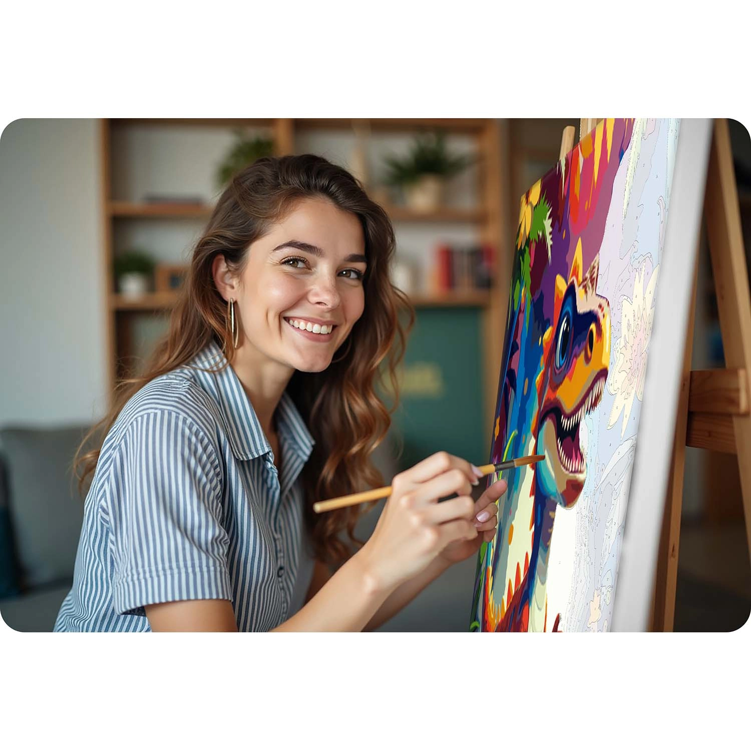 Objevte radost z tvorby s obrazem podle čísel 40 × 50 cm s motivem dinosaura. Set obsahuje vše potřebné: zagruntované plátno na rámu, až 30 krycích akrylových barev, 3 štětce různých velikostí a háčky na zavěšení. Díky barevné podmalbě s jemnými liniemi zvládnou malování i začátečníci a výsledek bude mít intenzivní barvy a plné krytí bez prosvítajících čar.
